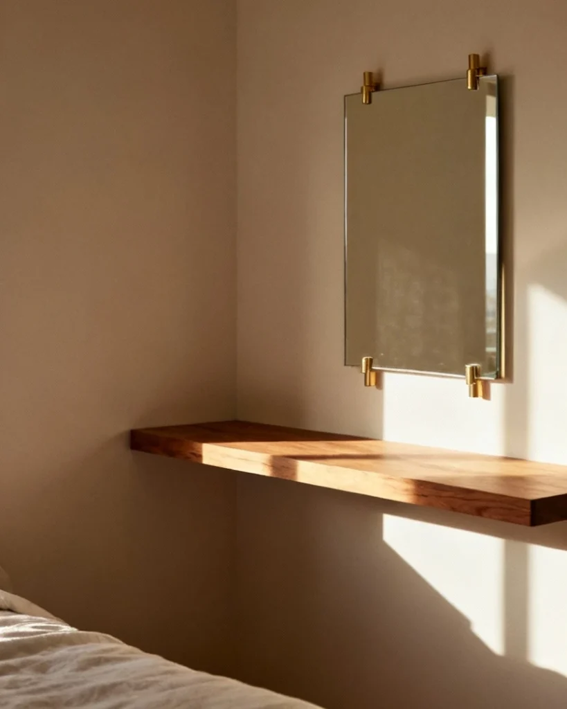 A wall-mounted shelf vanity offers a clean, airy feel that’s ideal for small spaces where floor area is precious. This approach uses a single floating shelf—often in white oak or walnut—paired with a frameless mirror and a slim drawer unit tucked beneath. The glam element comes from brushed brass drawer pulls and a small crystal table lamp, creating a refined look without overwhelming the room. It’s particularly effective in apartments or condos where every inch counts.