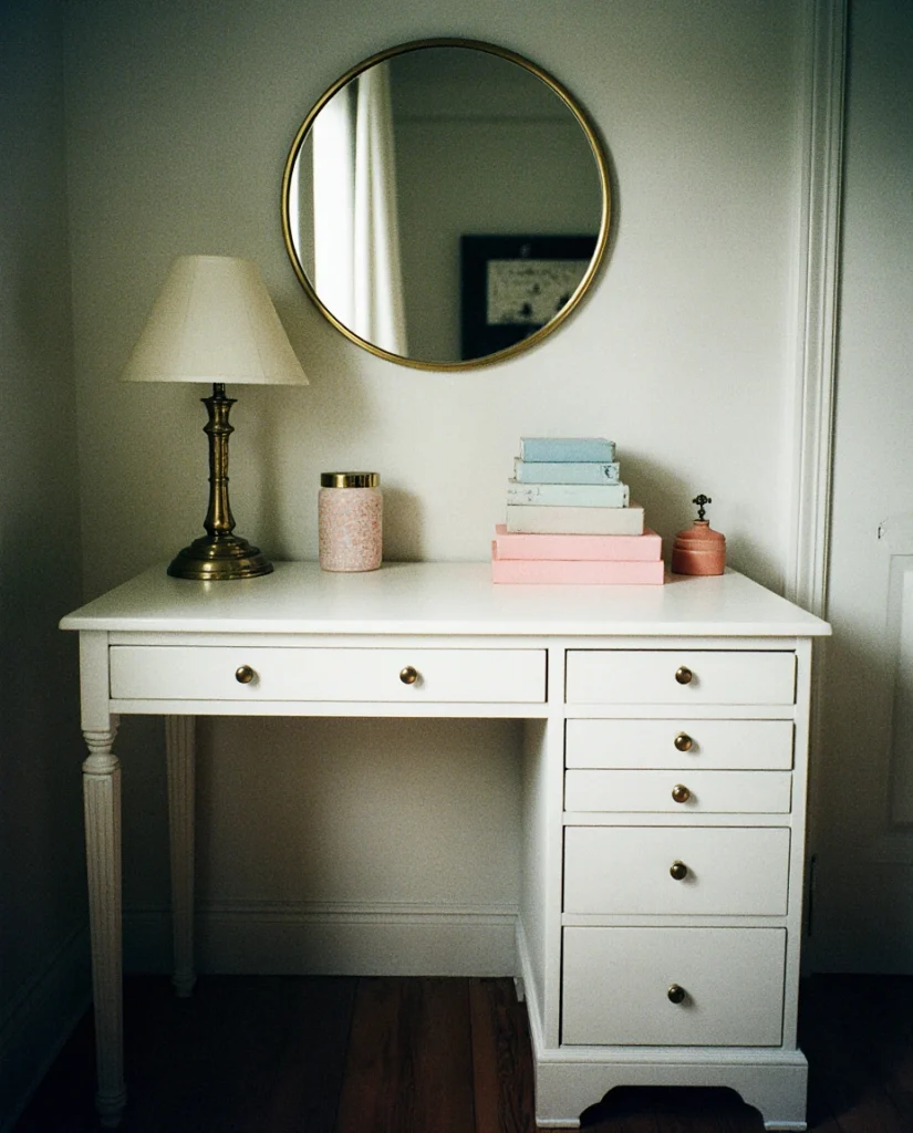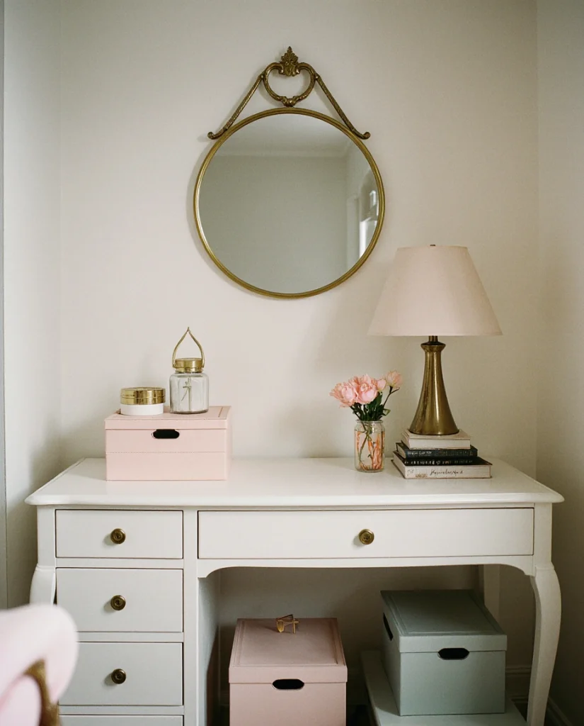 An aesthetic preppy vanity embraces clean lines, pastel accents, and organized simplicity. Picture a white lacquered desk with gold hardware, a round mirror with a thin brass frame, and aesthetic storage boxes in blush pink or mint green. This style appeals to younger homeowners and college students who want a polished, Instagram-ready space. Brands like Pottery Barn Teen and West Elm offer pieces that fit this category perfectly.