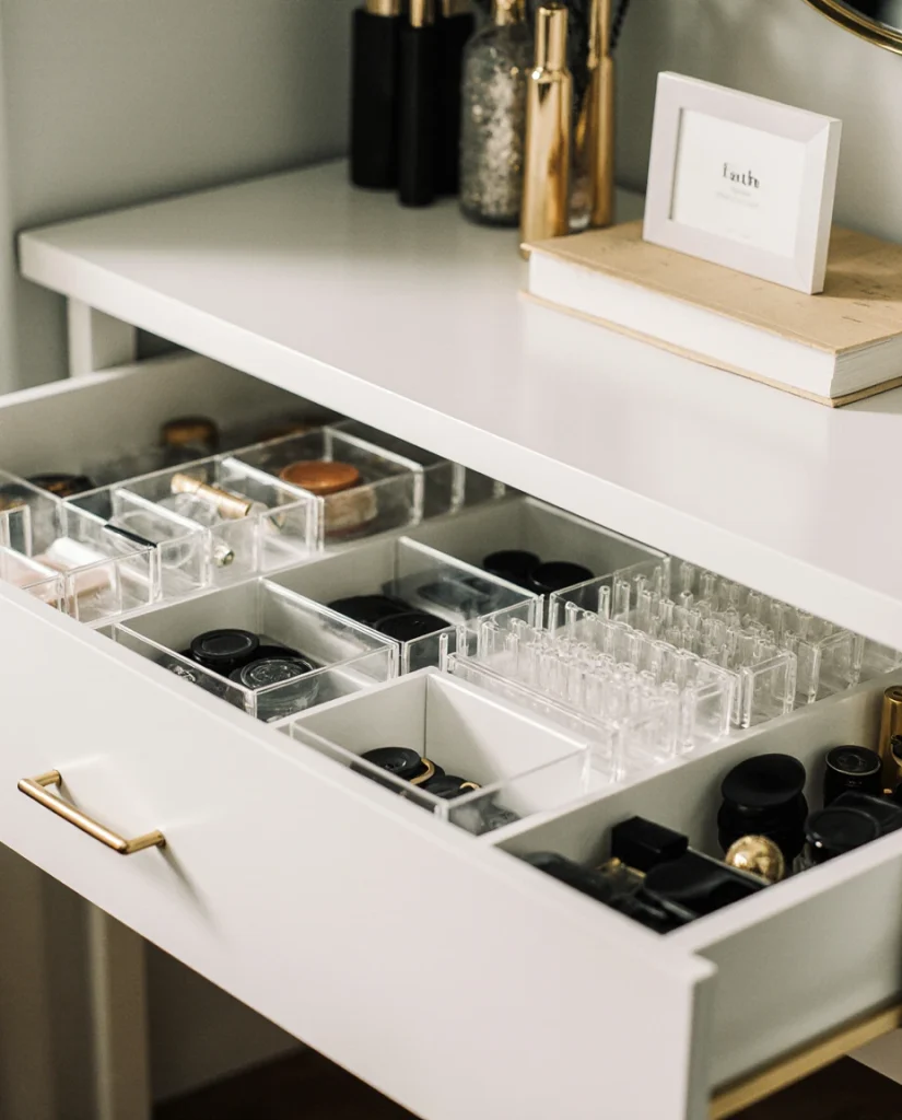 A makeup vanity built around an efficient makeup drawer organization system removes open storage display in favor of hidden storage. Hundreds of products can be kept sorted and accessible in deep drawers that have custom acrylic dividers, velvet-lined trays, and labeled sections. Add a simple table and a well-lit mirror, and you have an all-purpose setup with little fuss. This setup is preferred by minimalists and people who do not want a lot of visual clutter.