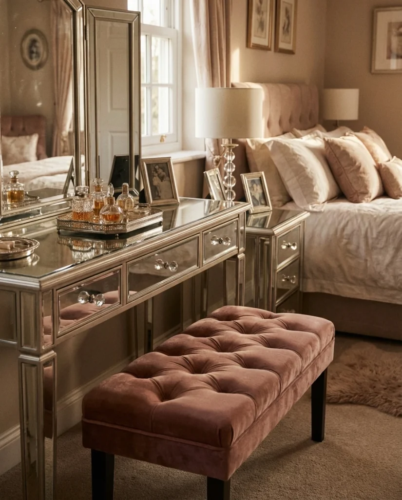 An elegant mirrored vanity brings Old Hollywood glamour into the modern bedroom, featuring reflective surfaces on drawer fronts and tabletops, accented with crystal or glass knobs. The mirrored finish bounces light around the room, making smaller spaces feel larger and brighter. This style pairs beautifully with silver or champagne-toned hardware and a tufted velvet bench. It’s a top choice for master bedrooms in traditional and transitional homes.