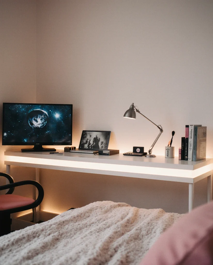 Where it works best: bedrooms of Gen Z users (ages 12–25) who spend significant time online and value spaces that support multiple hobbies. The dual-purpose desk eliminates the need for separate furniture pieces, freeing up floor space for seating or storage. Cable management becomes crucial here—invest in under-desk trays and clips to keep chargers, headphone wires, and LED power cords organized.