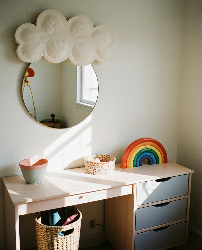Inspired by the playful aesthetics of Toca Boca, this vanity style uses rainbow pastels, rounded shapes, and whimsical accessories. Think a curved-edge desk in mint or lavender, a cloud-shaped mirror, and storage baskets in every color of the rainbow. This approach is popular among younger homeowners, particularly those decorating kids’ rooms or embracing maximalist, joyful design. It’s about creating a space that feels like a creative playground.