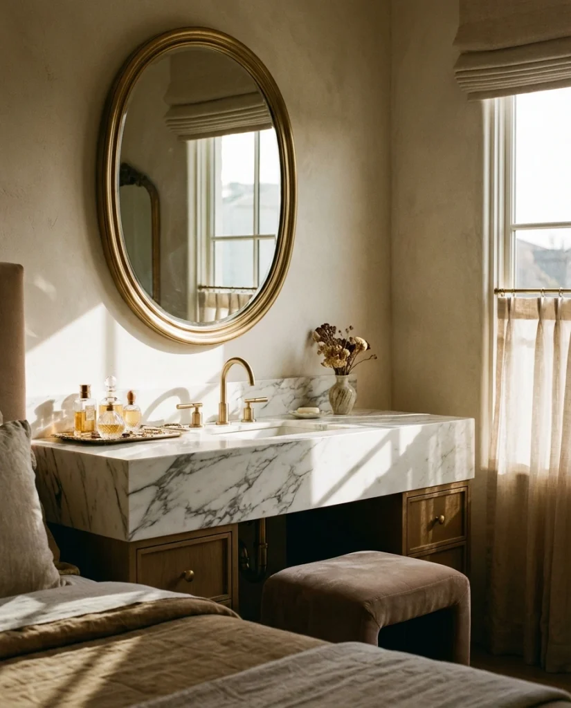 A modern luxury vanity featuring marble countertops and brushed brass accents delivers a high-end aesthetic that rivals boutique hotel bathrooms. The marble—often Carrara or Calacatta—provides a cool, veined surface perfect for makeup application, while brass drawer pulls, mirror frames, and lamp bases add warmth. This investment piece typically costs $1,200–$3,000 but elevates the entire bedroom’s design narrative. It’s most popular in upscale condos and renovated historic homes.