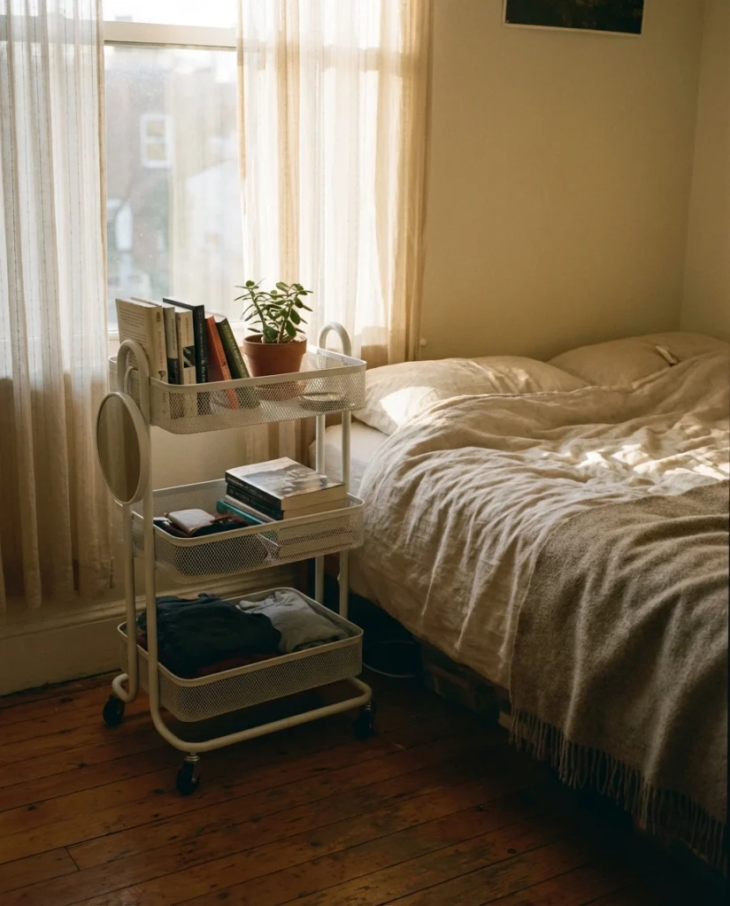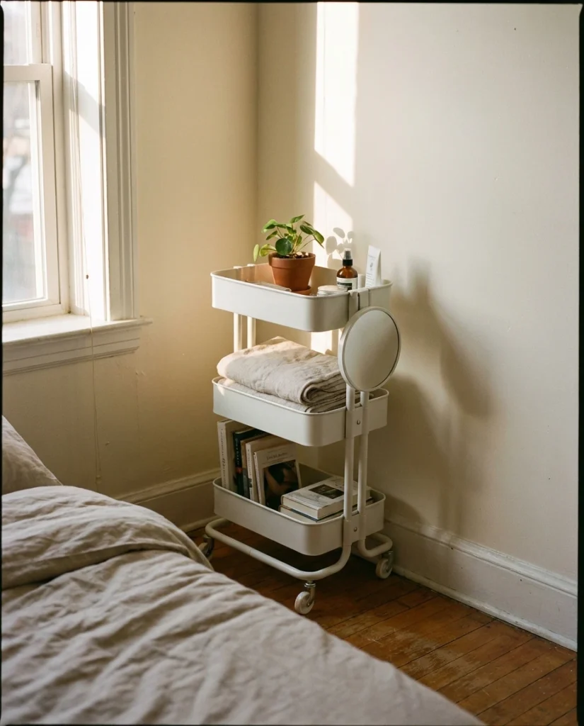 A rolling vanity cart brings ultimate flexibility to small spaces, allowing you to wheel your beauty station wherever the light is best or tuck it into a closet when guests visit. These carts typically feature three to four tiers of storage, a small attached mirror, and locking casters. The style works especially well in studio apartments, dorm rooms, or multipurpose bedrooms where permanent furniture placement isn’t practical. Brands like IKEA (Råskog cart) and Amazon offer affordable options.