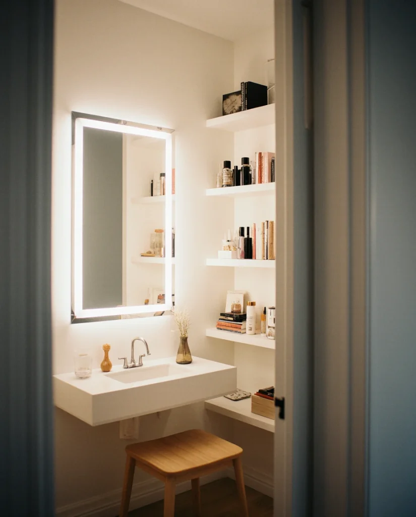 A vanity concealed inside a wardrobe or armoire offers a genius solution for bedrooms where visible beauty stations feel cluttered or where space is at an absolute premium. Open the wardrobe doors to reveal a fold-down mirror, interior lighting, and shelves stocked with cosmetics and tools. Close the doors, and it looks like a standard armoire. This approach is popular in Scandinavian countries and is gaining traction in American minimalist and tiny home communities.