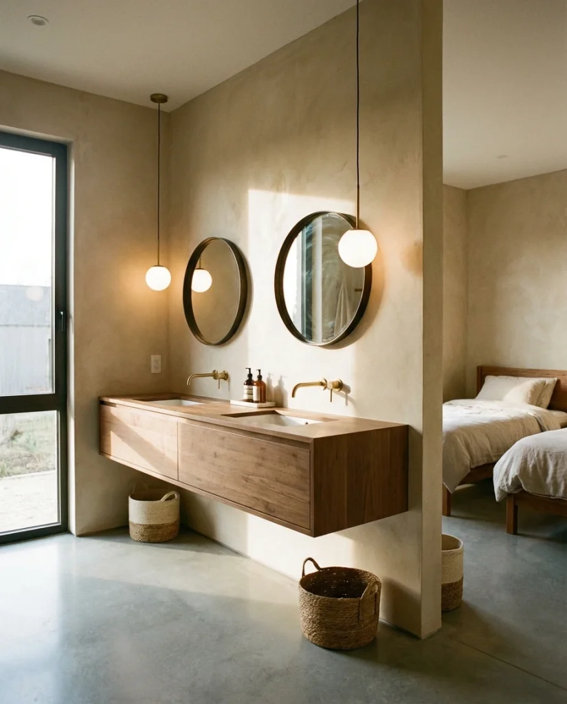An aesthetic wood vanity in Scandinavian style emphasizes light woods—birch, ash, and beech—with tapered legs and minimal ornamentation. The design philosophy centers on “lagom,” or just enough: sufficient storage, clean lines, and a neutral palette that doesn’t compete with the rest of the room. Add a simple round mirror and a wool throw over the bench for textural warmth. This style is particularly popular in Minneapolis, Seattle, and other northern cities.