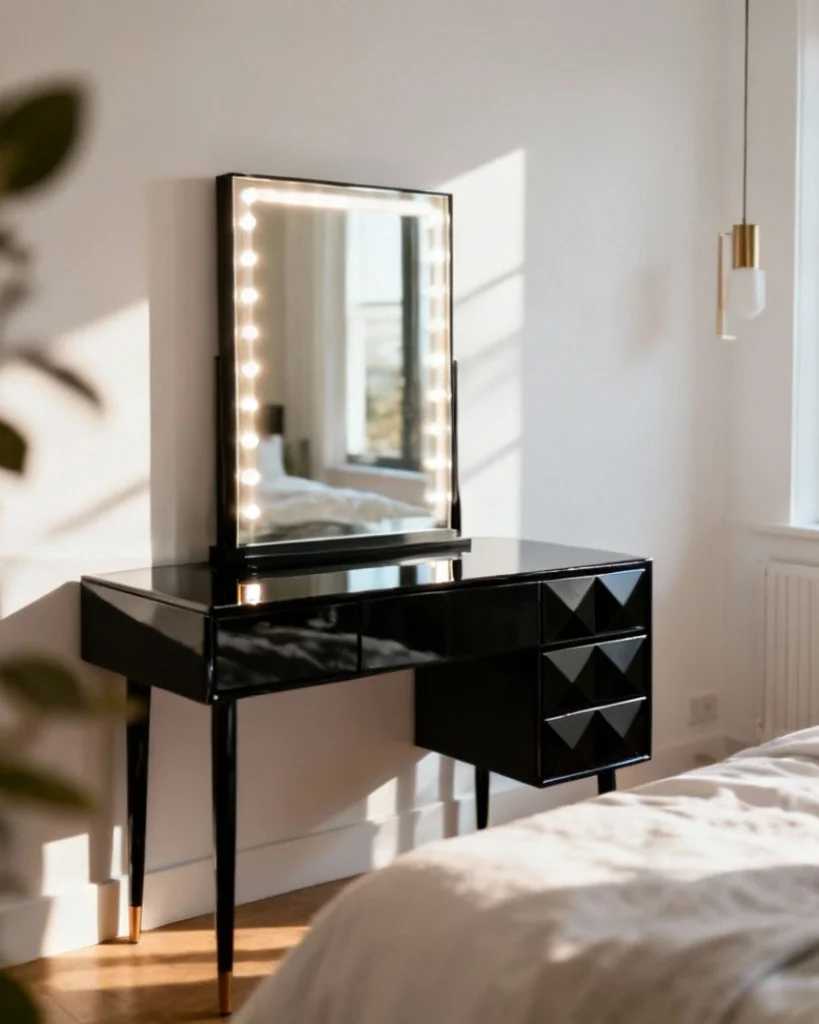 A black lacquered vanity offers bold contrast in bedrooms dominated by soft neutrals or whites. This modern luxury approach features high-gloss surfaces, geometric drawer fronts, and integrated LED lighting along the mirror’s edge. The reflective finish amplifies available light, making the piece feel both dramatic and functional. It’s a favorite among design-forward homeowners in coastal cities like Miami, Los Angeles, and Seattle.