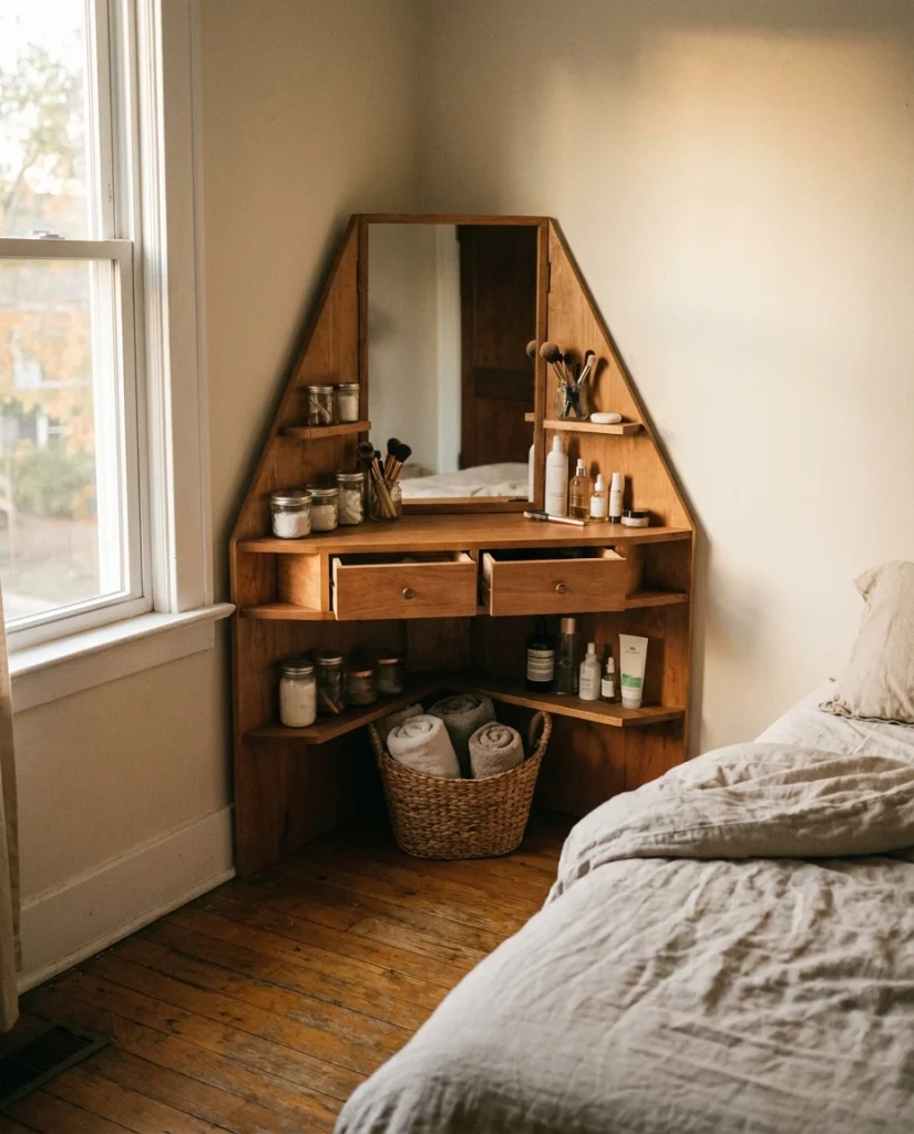 A corner makeup vanity transforms an otherwise overlooked nook into a highly functional beauty zone. Triangular or L-shaped designs fit snugly into room corners, offering two sides of counter space for product display and daily routines. Many versions include angled mirrors and pull-out trays for brushes and palettes. This solution is especially popular in small rooms where traditional rectangular vanities would block pathways or windows.