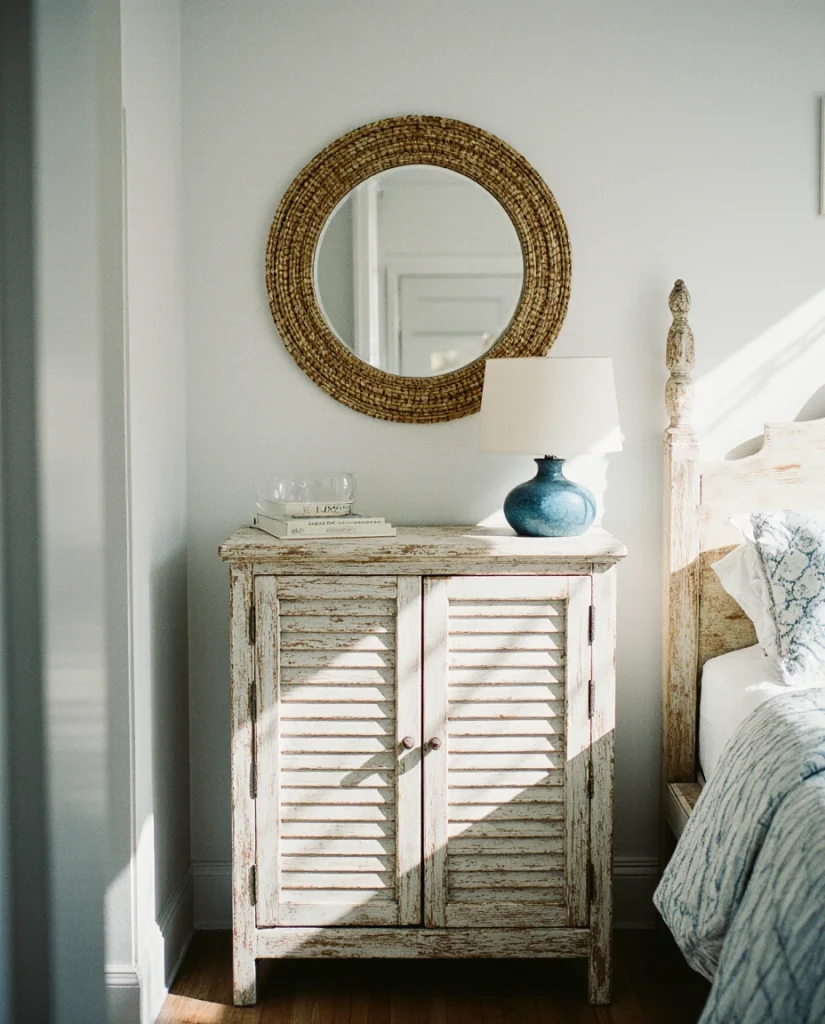 A coastal vanity in white-washed or driftwood-finish wood brings a breezy, relaxed vibe to bedrooms, particularly in beach towns and lakeside homes. These pieces often feature louvered drawer fronts, rope drawer pulls, and a distressed finish that mimics weathered beach huts. Pair with a rattan mirror frame and soft blue or sand-colored textiles to complete the look. The style resonates strongly in Florida, California, and the Carolinas.