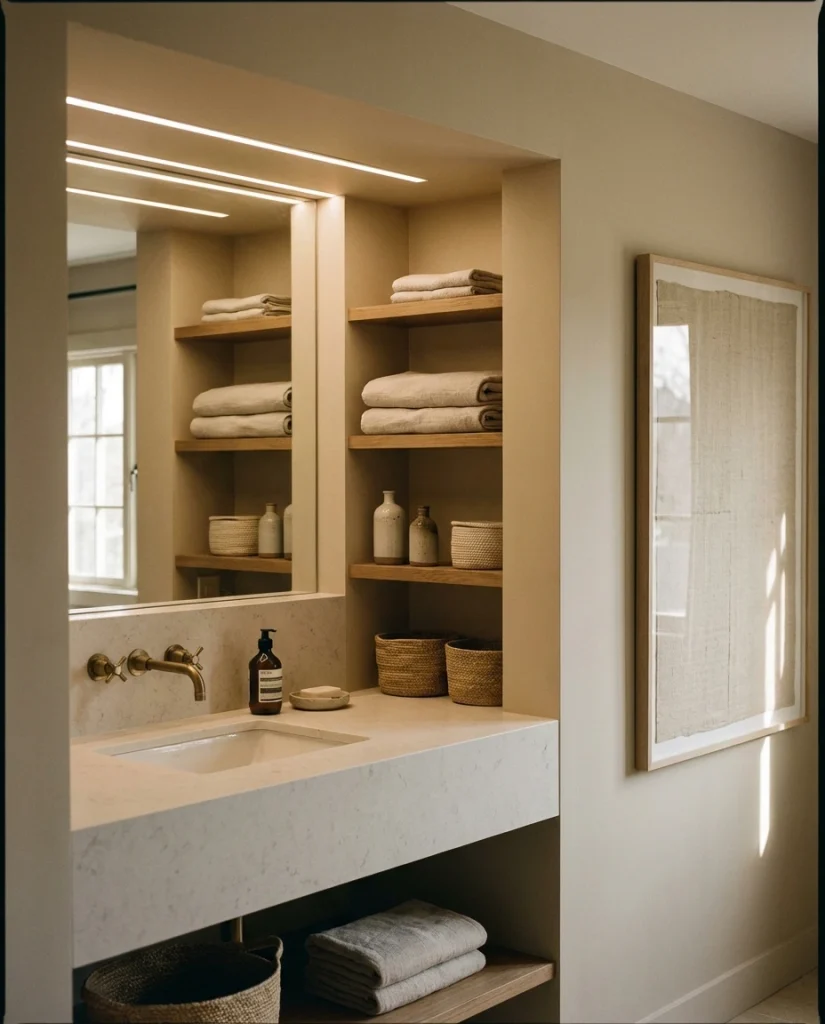 A built-in vanity carved into a wall niche offers a seamless, architectural approach that maximizes space without adding furniture bulk. Typically constructed during renovations or new builds, these vanities feature integrated shelving, recessed lighting, and custom-fitted countertops in quartz or marble. The classy result feels like a boutique hotel amenity. It’s a long-term investment popular in high-end homes across suburbs and planned communities.