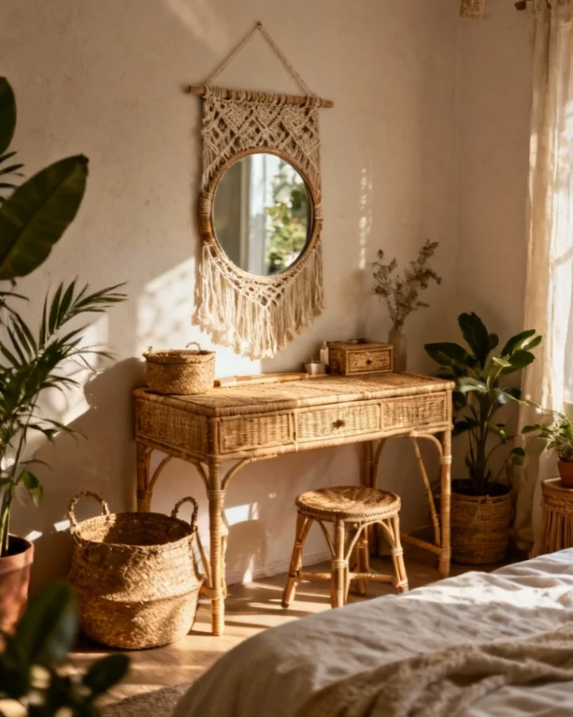 A bohemian vanity setup layers natural textures—rattan, macramé, and jute—with vintage finds and earthy tones. Think of a secondhand wood desk painted in sage or terracotta, topped with a round macramé-framed mirror and woven baskets for storage. This eclectic approach celebrates imperfection and personal curation, making it ideal for renters and creatives who move frequently. The look is big in college towns, Portland, and parts of the Southwest.