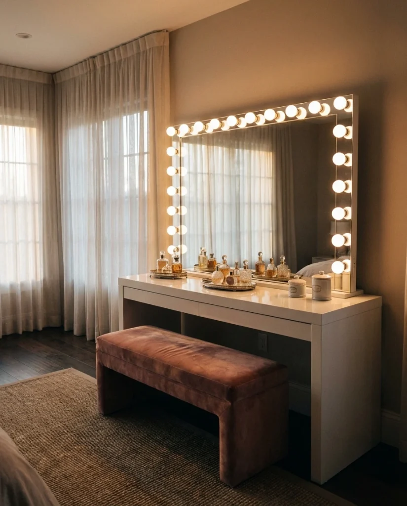 A large vanity centered around a Hollywood lighted mirror makes a dramatic focal point, offering both function and glamour. These mirrors feature built-in bulbs around the perimeter, providing even, shadow-free lighting that’s essential for precise makeup application. Pair with a spacious tabletop in white or mirrored glass and a plush velvet bench. This setup is particularly popular among beauty enthusiasts and influencers who film content at home.