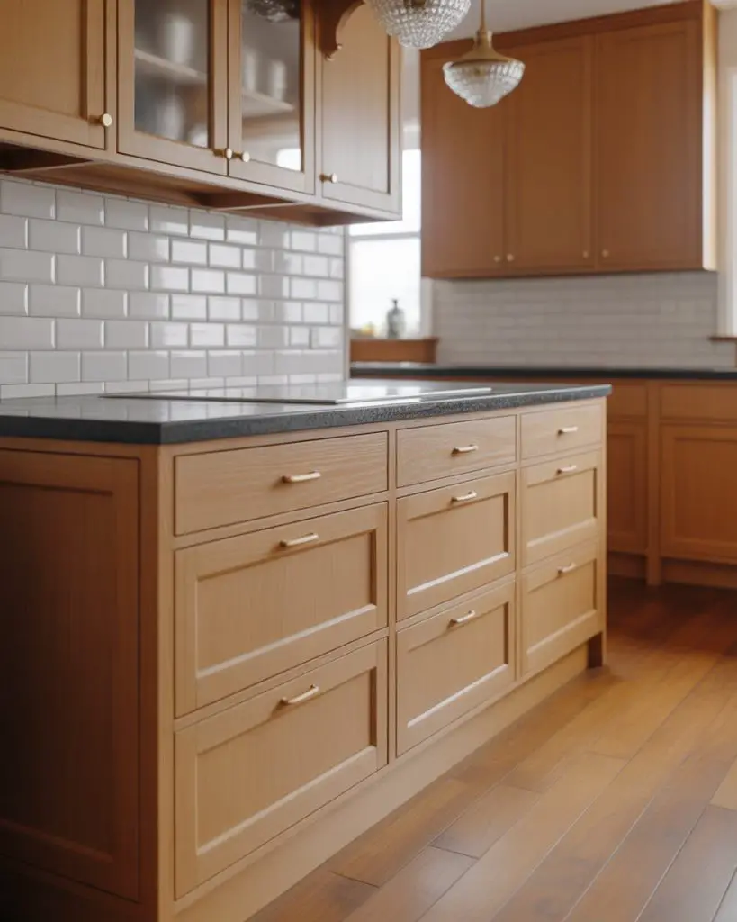 This look works best in open-concept homes where the kitchen flows into the living or dining area—the warm oak keeps things inviting while the dark counters ground the space and prevent it from feeling too light or washed out. Gold hardware in particular has seen a resurgence because it bridges the gap between traditional brass and ultra-modern finishes, making it a smart choice for homeowners who want their kitchen to feel current without chasing fleeting trends.