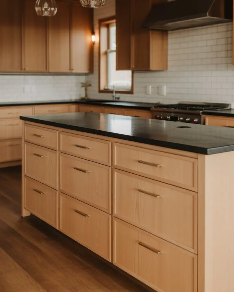The combination of warm white oak cabinets with a black counter creates dramatic visual impact while remaining surprisingly versatile across design styles. Whether you choose honed granite, soapstone, or engineered quartz in matte black, the dark counters provide a strong horizontal line that anchors the lighter cabinetry and draws the eye across the workspace. This pairing works equally well in modern, transitional, and even industrial-style kitchens.