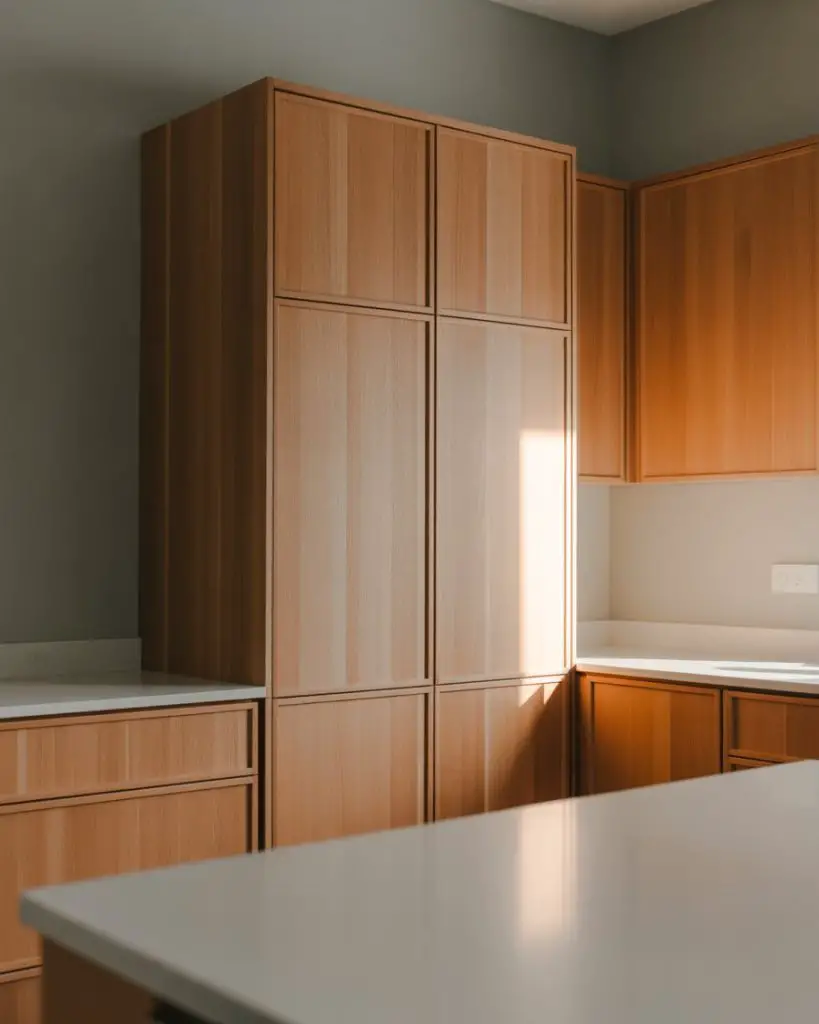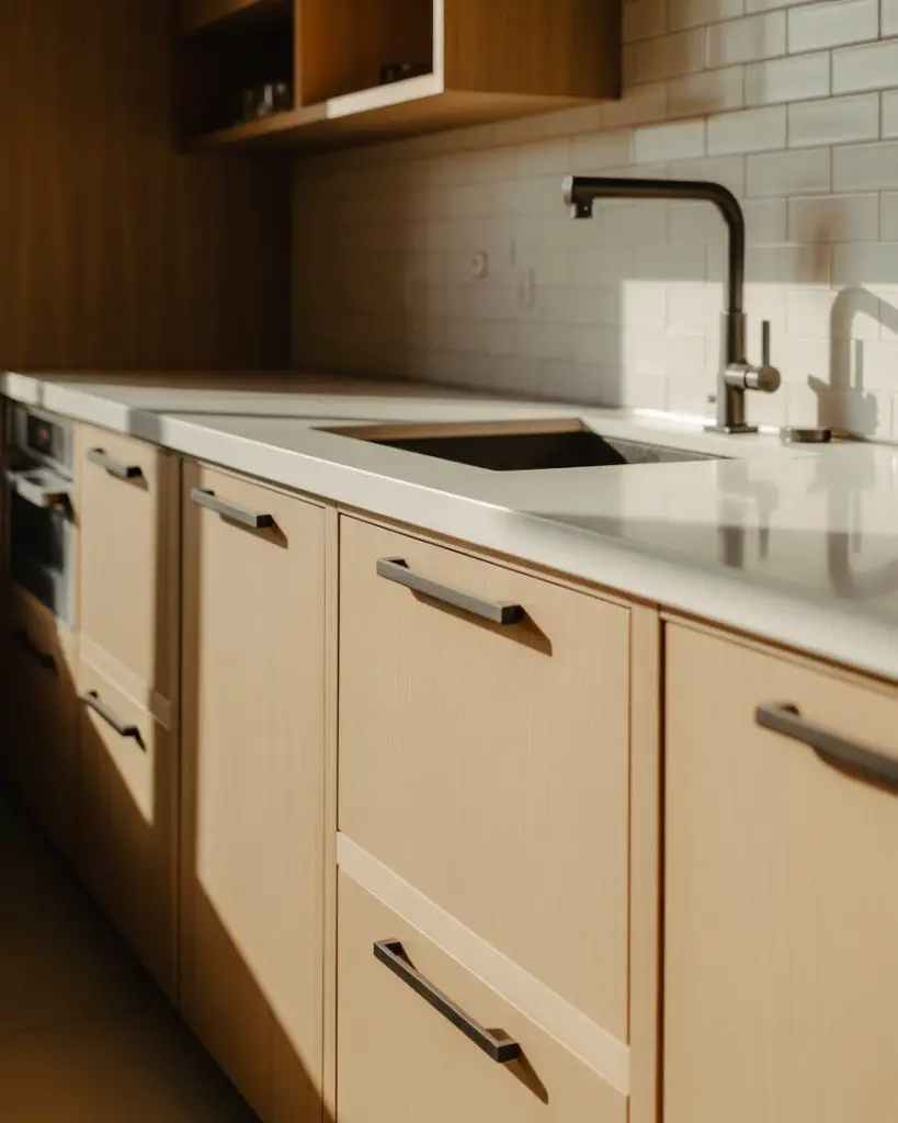 Where this works best: in newer construction or gut renovations where ceiling heights allow for taller upper cabinets—the slim proportions can make standard 30-inch uppers look dated, but 42-inch or full-height cabinets showcase the style beautifully. The streamlined appearance also complements handleless or push-to-open systems, which many American homeowners are adopting for their clean aesthetic and ease of use when hands are full.