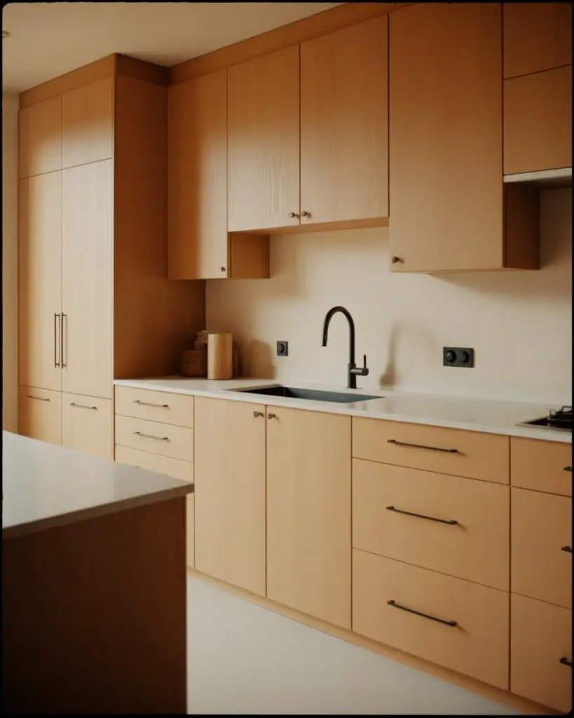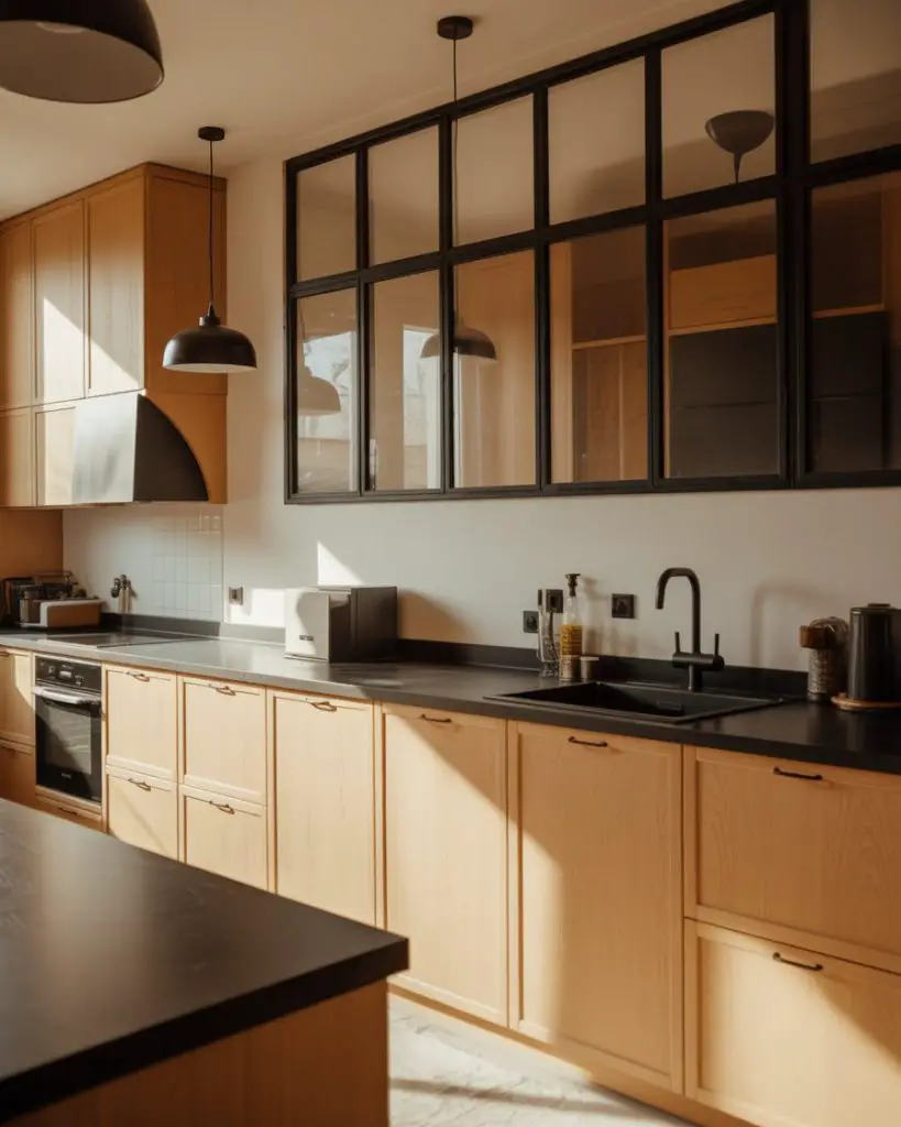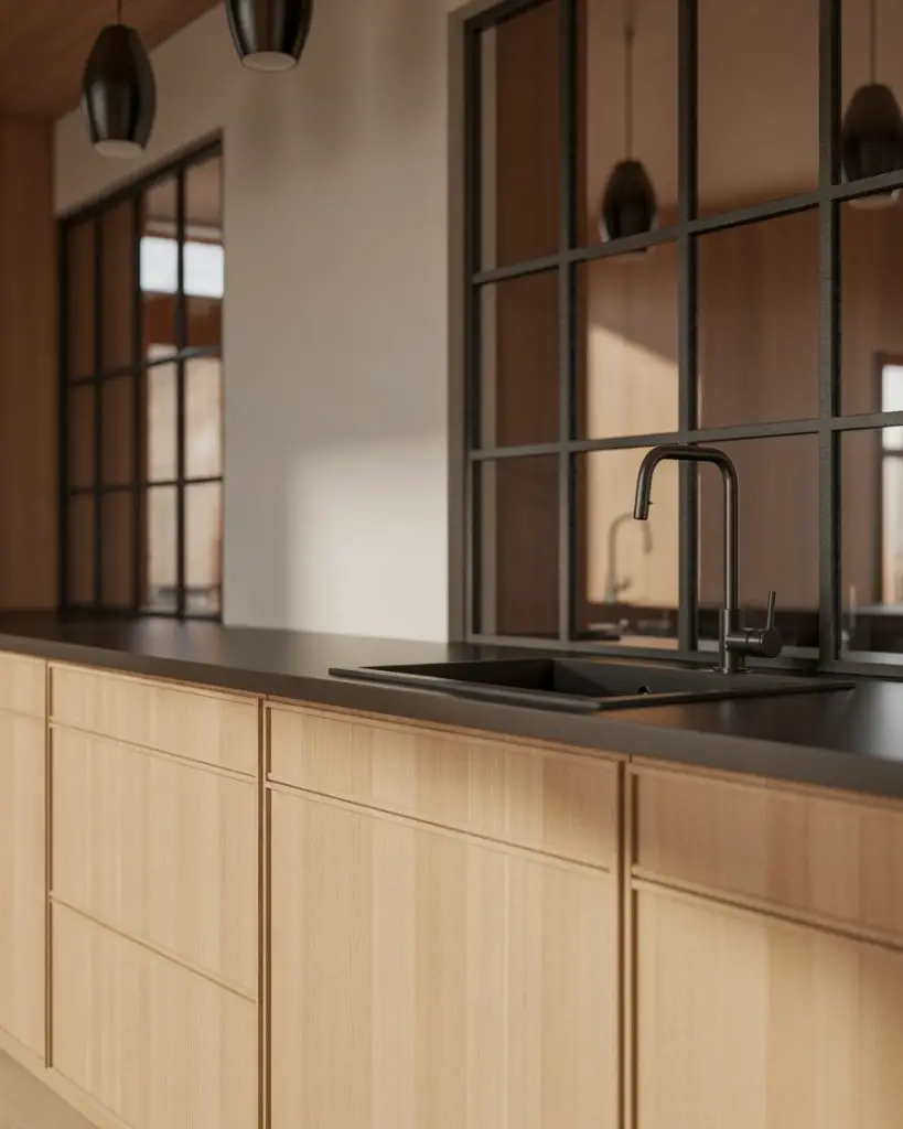 A common mistake here is overdoing the black elements—when every surface, fixture, and detail is black, the space can feel heavy and unwelcoming. The most successful executions use black strategically, perhaps on hardware and one major element like countertops or windows, while keeping walls, backsplash, and flooring lighter to maintain balance. This restraint allows the black accents to make a statement without overwhelming the natural beauty of the white oak.