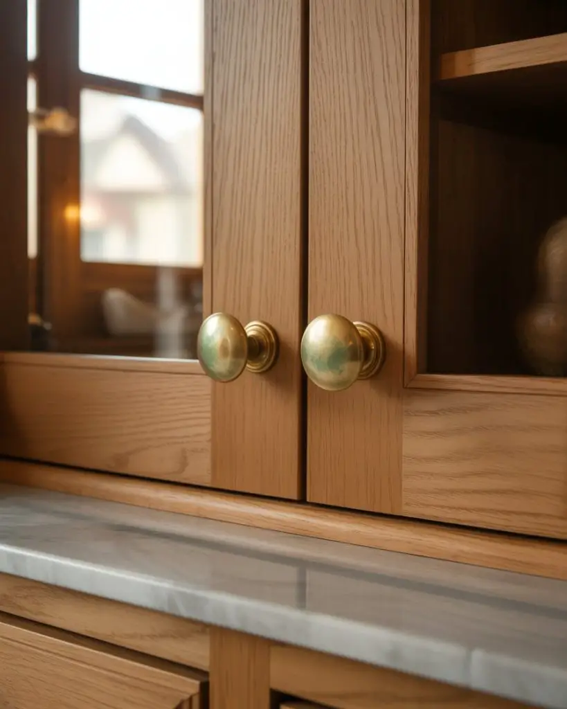 The warmth of brass hardware enhances white oak’s golden undertones, creating a cohesive, sunlit feeling throughout the kitchen. Unlike cooler metals like chrome or nickel, brass shares the same warm color family as the oak, resulting in a harmonious rather than contrasting effect. Unlacquered brass develops a living patina over time, adding character and depth that actually complements the natural aging process of wood.