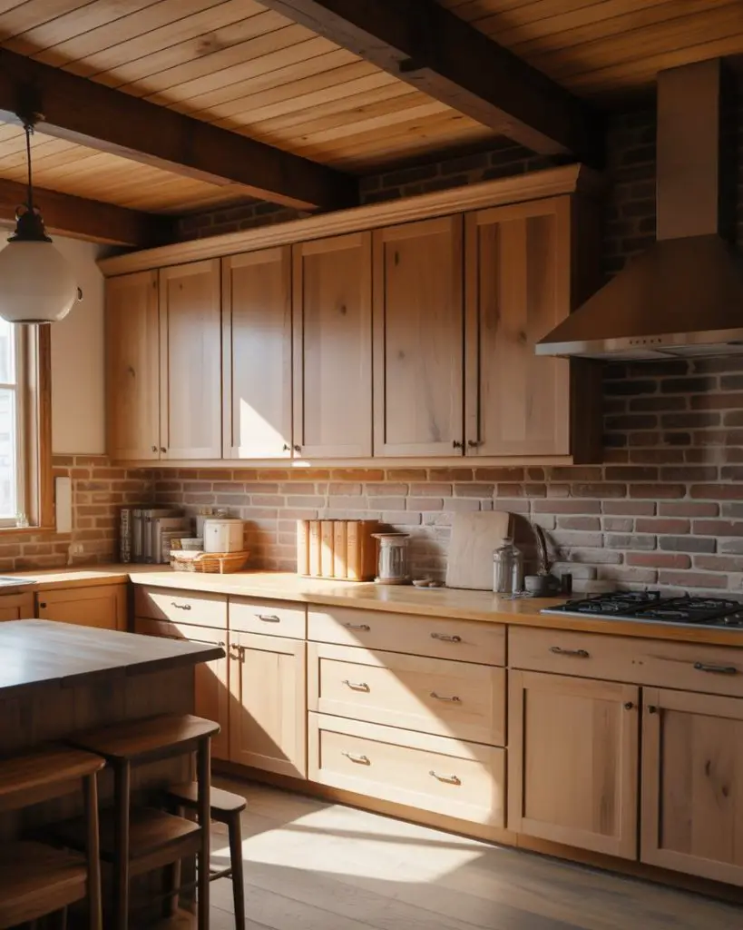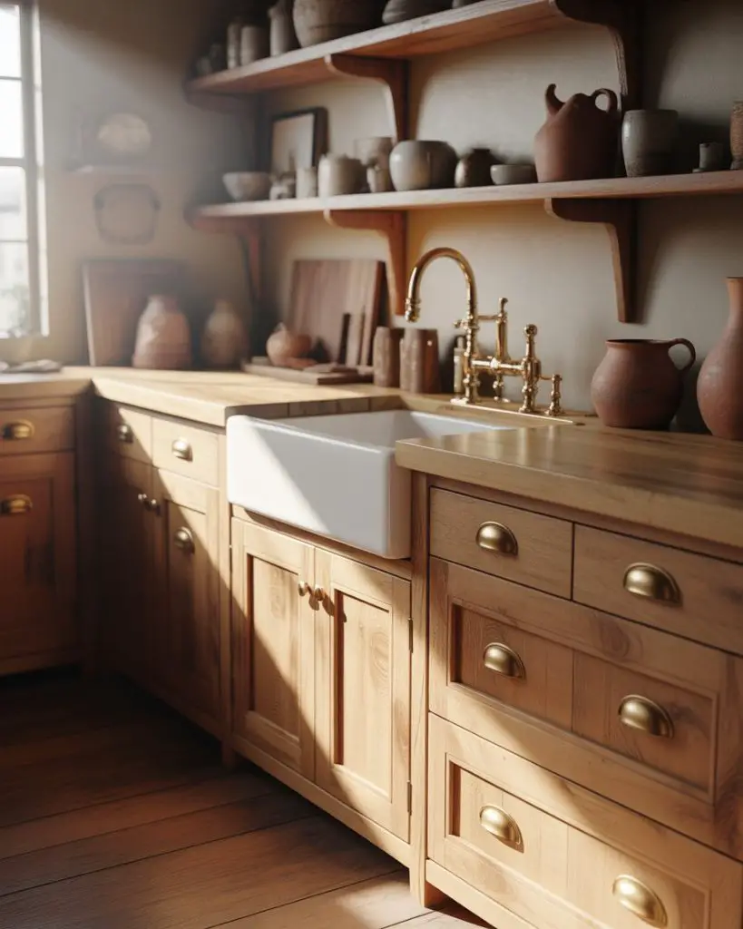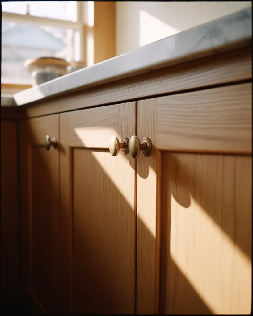 Rustic white oak cabinets bring texture and character through visible knots, mineral streaks, and natural imperfections that tell the story of the tree. Paired with brass hardware, this look channels farmhouse and country cottage charm while maintaining enough refinement for modern tastes. The warm patina of brass complements the honey tones in the oak, creating a kitchen that feels collected over time rather than installed all at once.