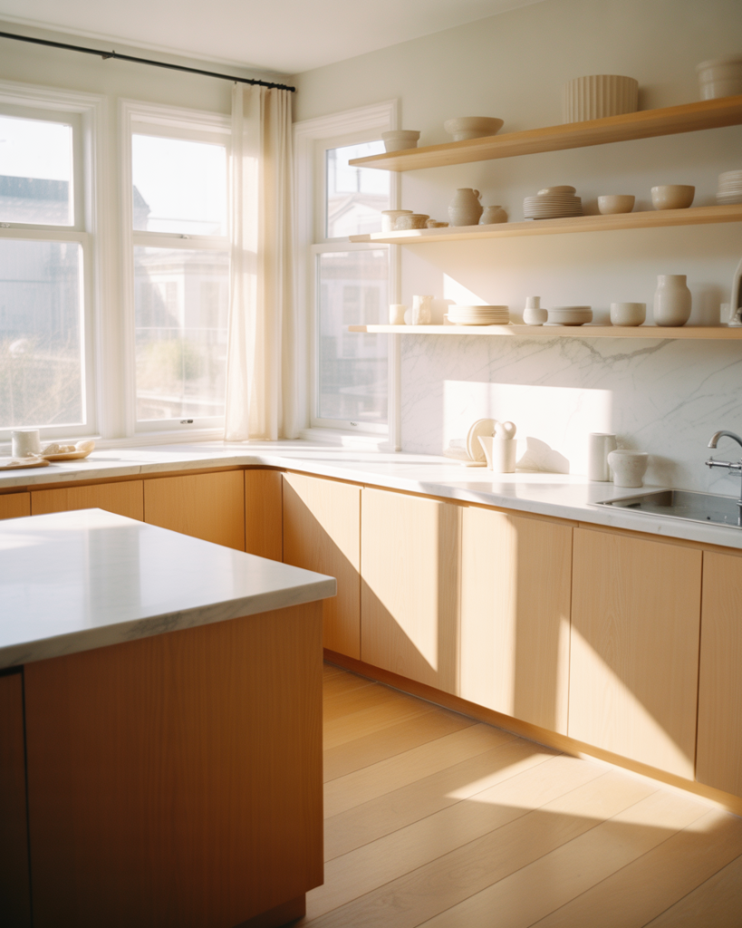 Maximizing the light, airy potential of white oak cabinetry means choosing complementary elements that enhance rather than weigh down the space. Natural or barely-there finishes on the oak, paired with white quartz or marble counters, pale tile or wood flooring, and minimal upper cabinets or open shelving, creates a Scandinavian-inspired kitchen that feels spacious and calm. Large windows, simple pendant lights, and uncluttered countertops complete the serene aesthetic.