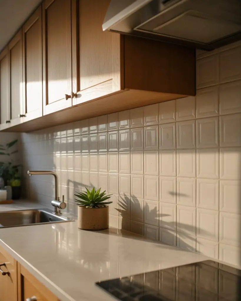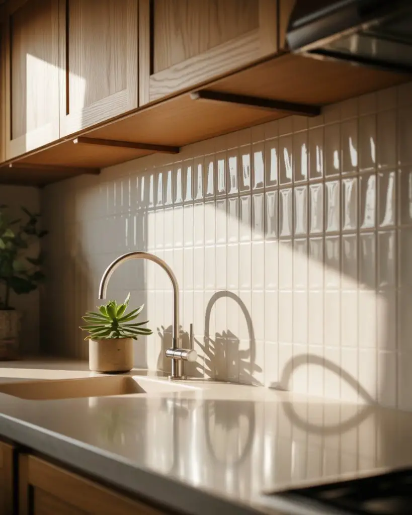 The right backsplash ideas add texture and personality while allowing white oak cabinets to remain the star. Consider dimensional options like three-dimensional ceramic tiles, stacked stone ledgers, or handmade zellige that catch light and create depth. For a more subtle approach, large-format porcelain slabs in matte finishes or natural stone with movement provide visual interest without busy patterns that might compete with the wood grain.