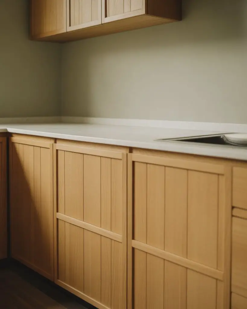 Rift sawn white oak cabinets feature an even straighter grain than quarter sawn, with minimal flecking for an ultra-clean, contemporary look. When paired with slim shaker door profiles, this combination creates a sleek, almost Scandinavian aesthetic that’s perfect for modern minimalist kitchens. The narrow frame widths of slim shaker doors emphasize the vertical grain lines, creating a sense of height and elegance that works beautifully in both small and large spaces.
