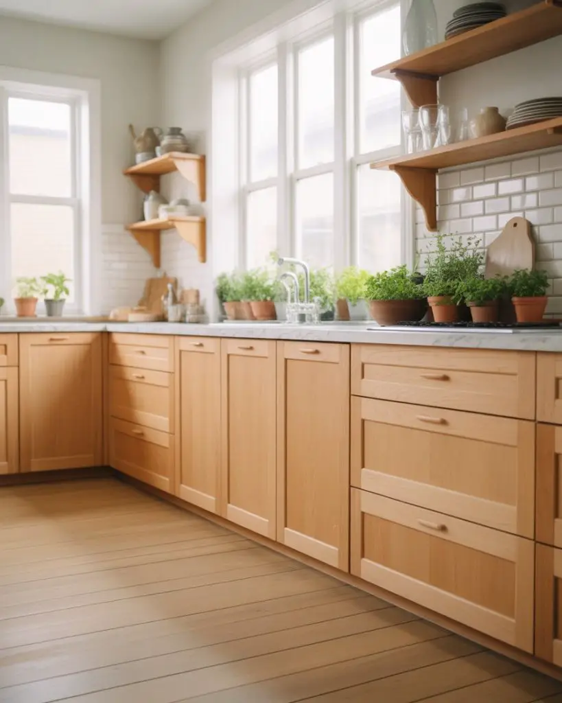 Keeping white oak cabinets in their natural state—with just a clear protective finish—creates a light, airy kitchen that feels fresh and modern. When combined with light hardwood or engineered flooring in similar tones, the effect is a gentle, monochromatic palette that expands the sense of space and brings a Scandinavian-inspired calm to the room. This approach lets the wood’s inherent warmth and grain patterns take center stage without competing colors or heavy stains.