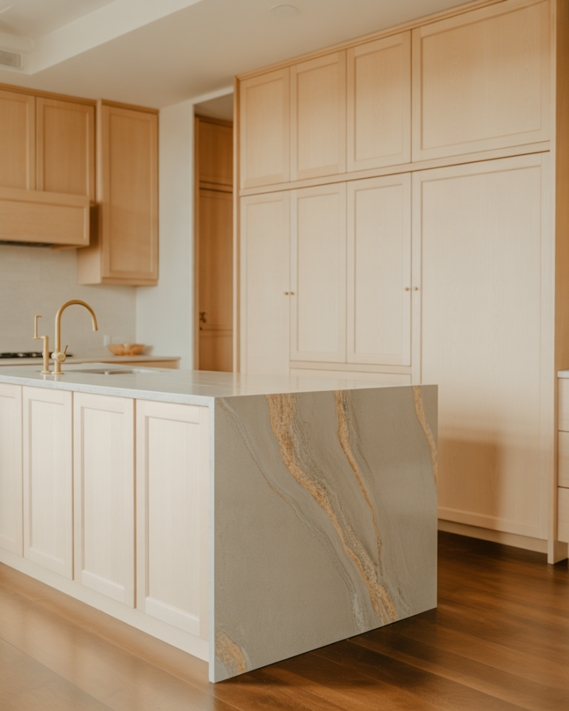 Pairing white oak cabinetry with Taj Mahal quartzite countertops delivers a sophisticated, high-end look that balances warm and cool tones beautifully. This popular natural stone features creamy white backgrounds with soft gray and taupe veining that complements the golden undertones in white oak without clashing. The subtle movement in the stone adds visual interest while maintaining the calm, organic feel that makes white oak so appealing.
