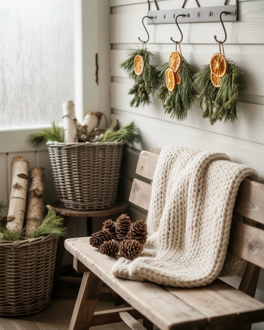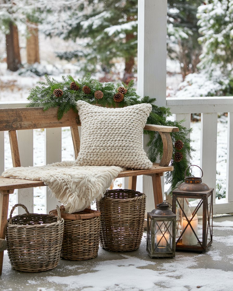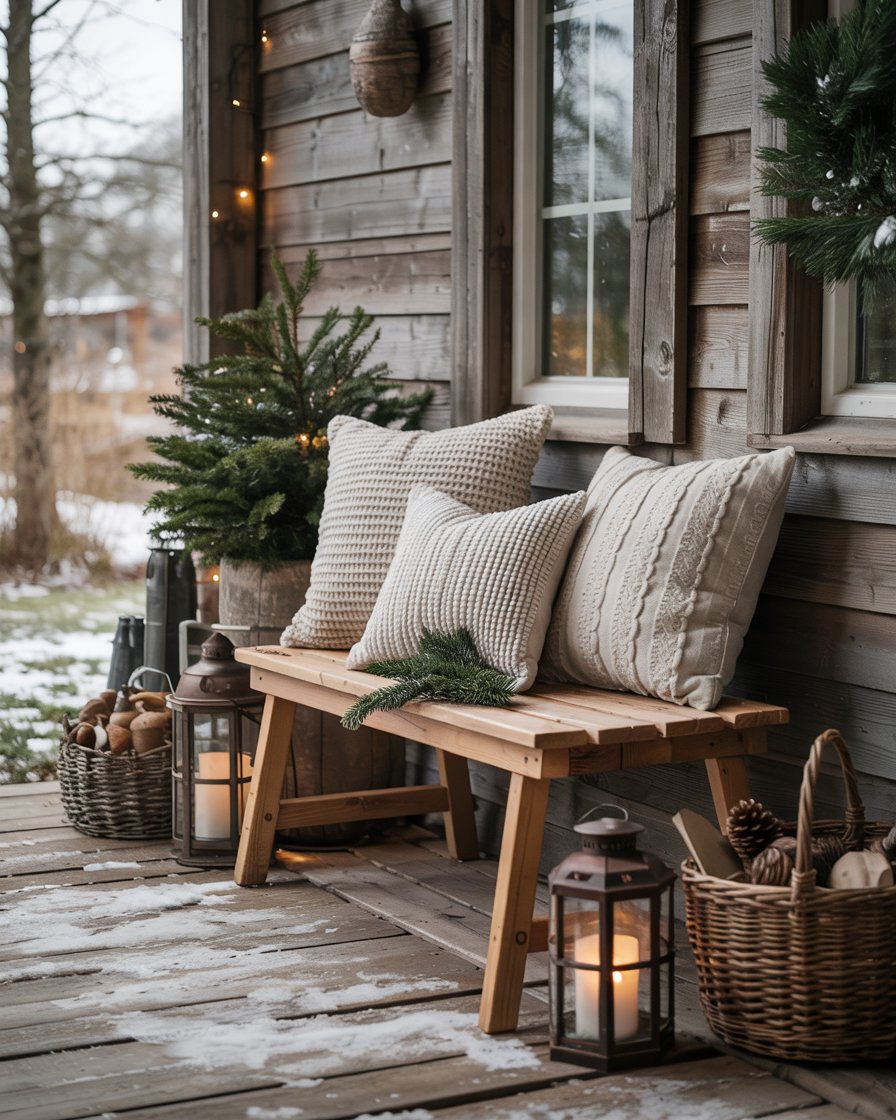 Winter has no room in an interior. Set up a rustic porch with natural garlands, lanterns, and a wooden bench to create a lovely welcome sight. This is one of the finest ideas for the home that feel festive yet not Christmas, blending winter greens with subtle textures in preference to overt holiday motifs. Some crocheted pillows and primitive baskets can further warm the overall look while keeping it simple and natural.