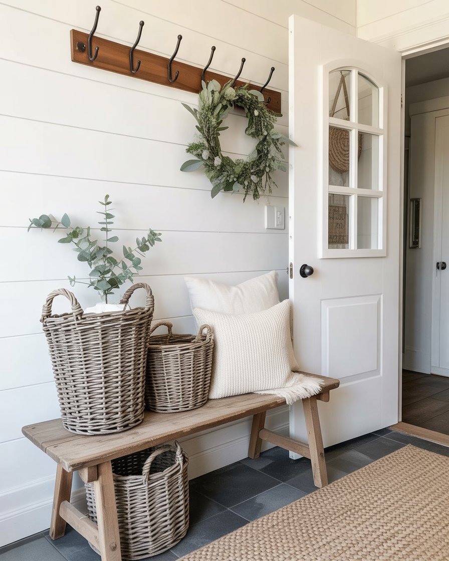 Farmhouse-style natural materials and rustic charms for entryways set the tone for all of the home. Think vintage coat hooks, wicker baskets for boots, and simple greenery instead of holiday garlands. This ideas for the home look will go wonderful post-Christmas, keeping your cozy space inviting and organized through winter.