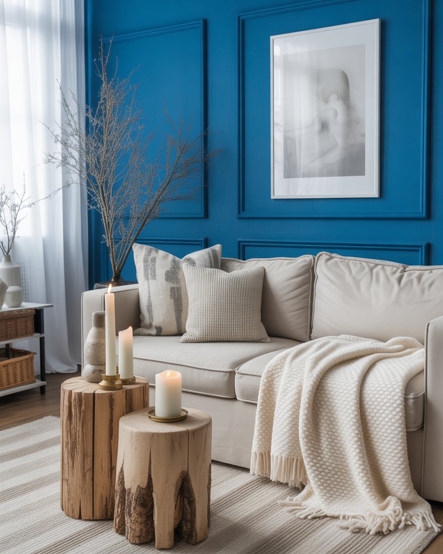 Statement walls in shades of blue bring a fresh, modern twist to winter decor. A spacious living area or cozy bedroom with a saturated navy or icy blue wall pairs with light furniture and rustic wood detailing, creating calm after Christmas, and this vibe is non-holiday. Soften throws and neutral art adorn the walls to glam this lookup of ideas for the home.