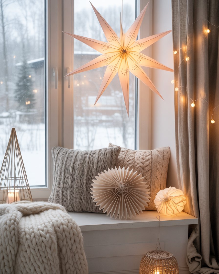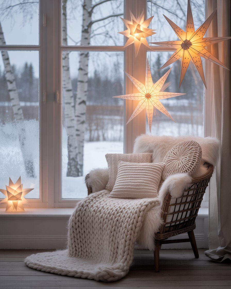Transforming a simple window seat into a Hygge retreat is one of the coziest ideas for the home this season. Scandinavian style window nooks with layered cushions, chunky knit blankets, and paper star lanterns create intimate spaces perfect for reading or sipping tea. These simple touches keep your home feeling warm and bright well after Christmas, especially during long winter evenings.