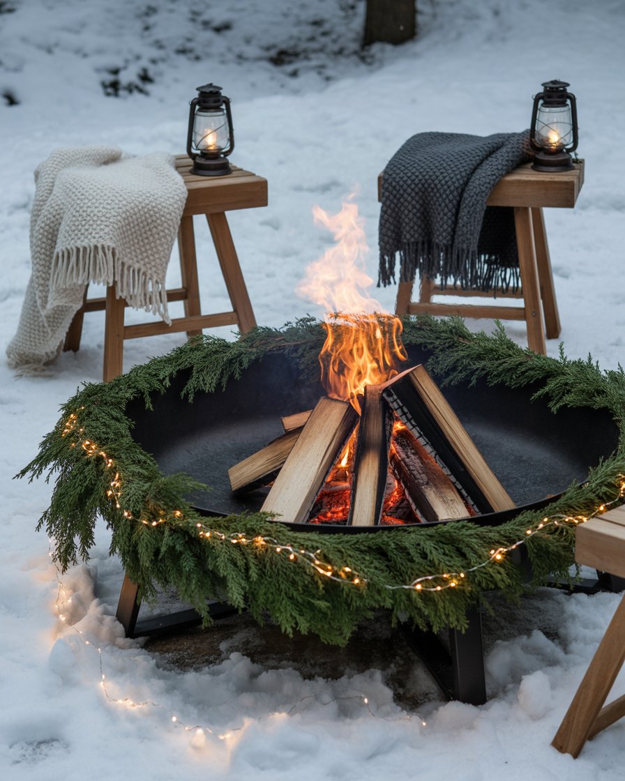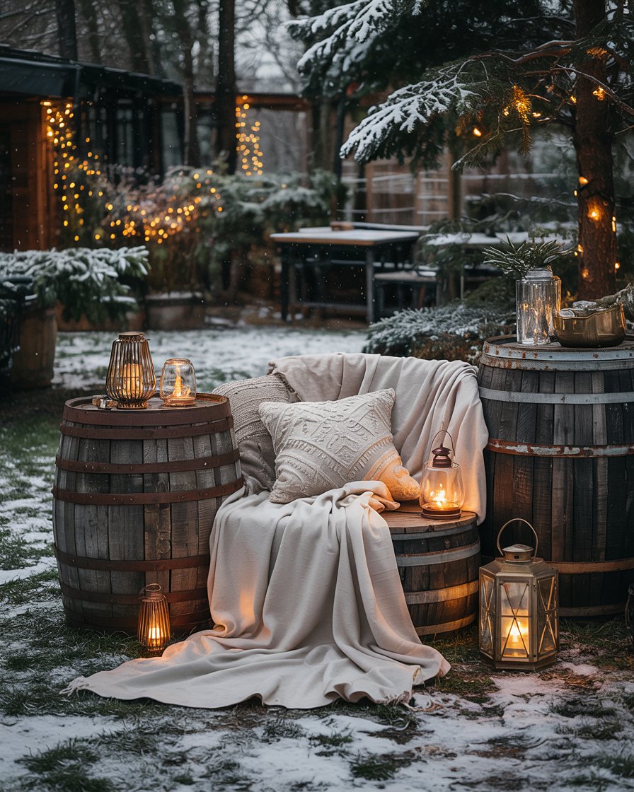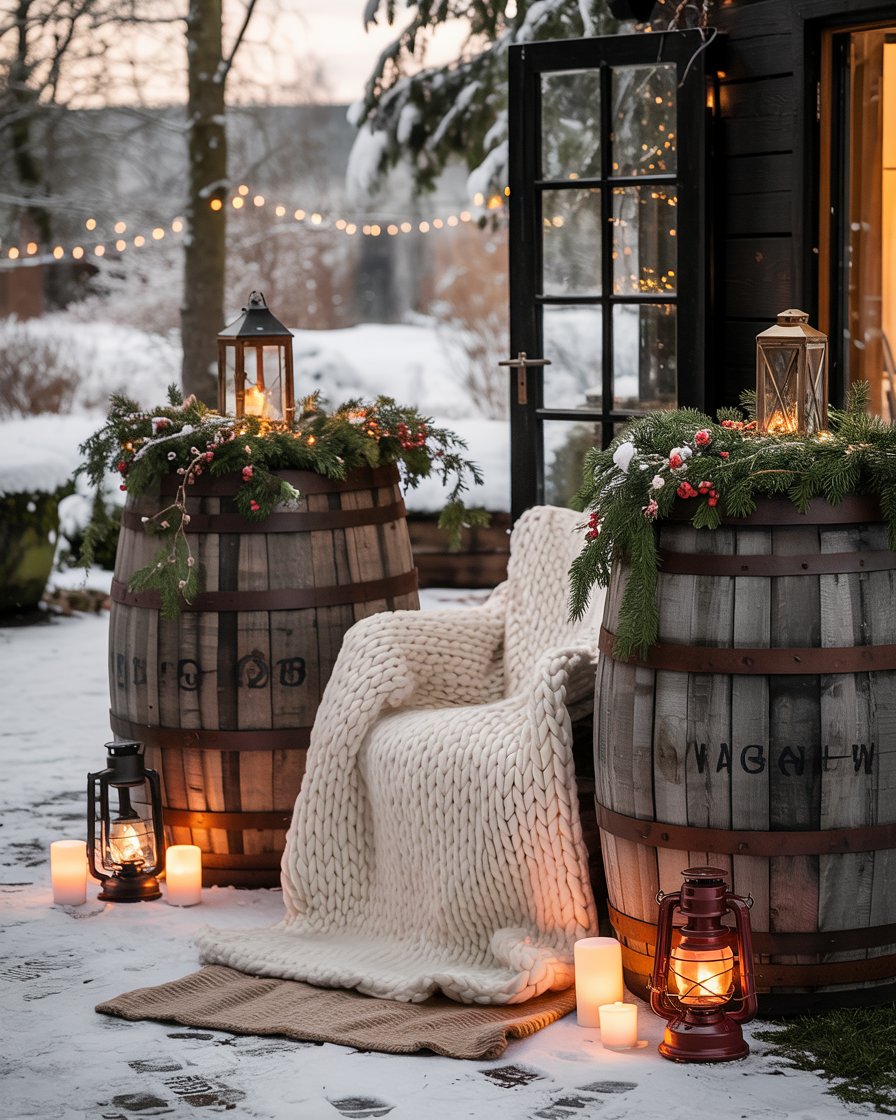 Outdoor spaces can feel like Nordic retreats with Scandinavian sauna-inspired styling. Wooden barrels, wool throws, twinkling string lights, and natural evergreen accents turn a simple backyard into a cozy winter oasis. This is one of the most rustic yet luxurious ideas for the home that’s perfect for gatherings after Christmas, adding both function and aesthetic appeal.