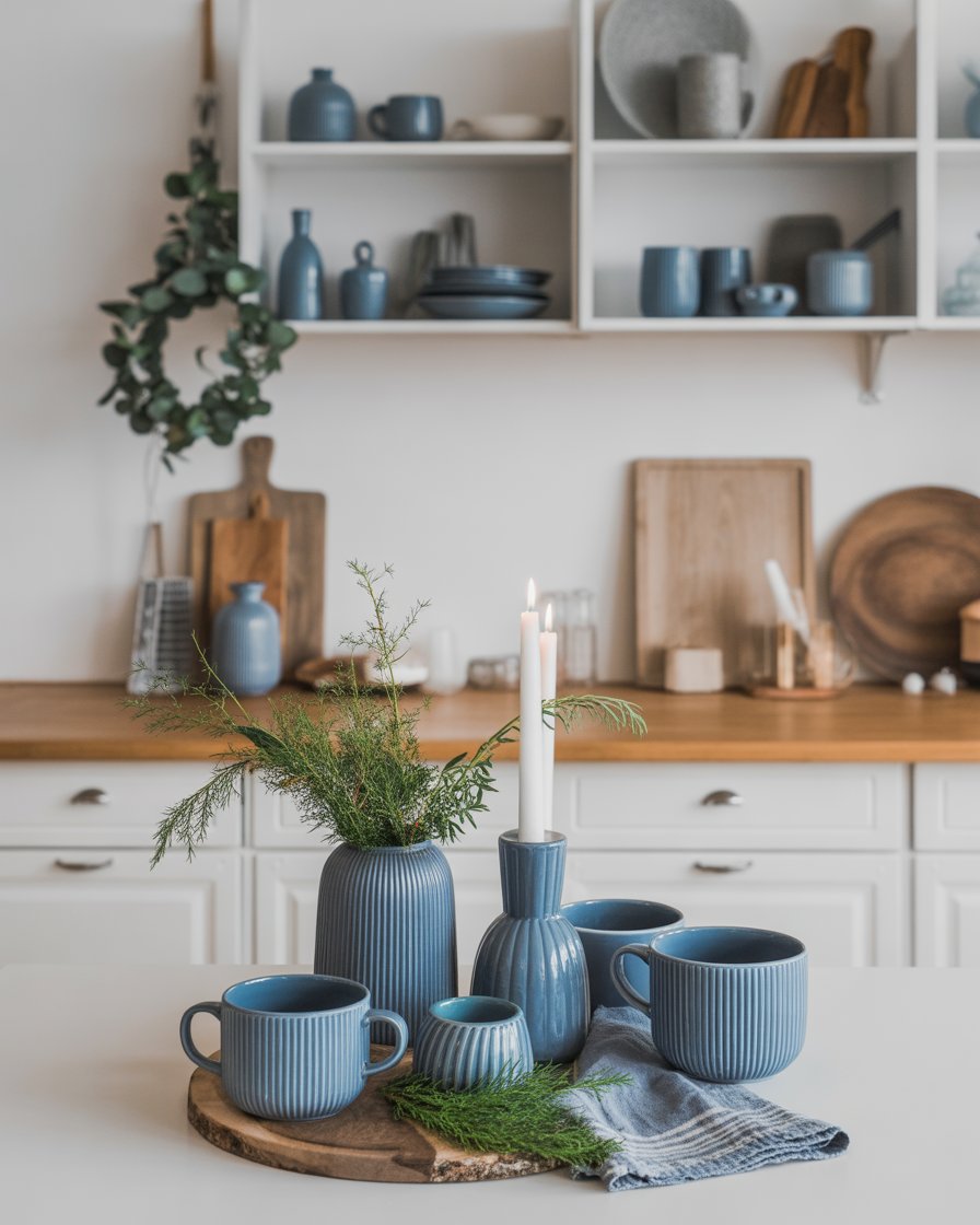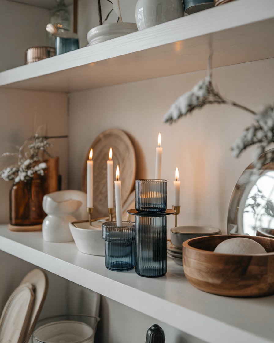 Open shelving offers endless possibilities for winter decorations. Arrange Scandinavian ceramics, taper candles, blue glassware, and natural wooden bowls for a calm, aesthetic display. The key is to keep it simple, layering textures and tones without clutter. This idea works well in kitchens, hallways, or bedroom corners, creating soft visual interest that lasts well after Christmas.