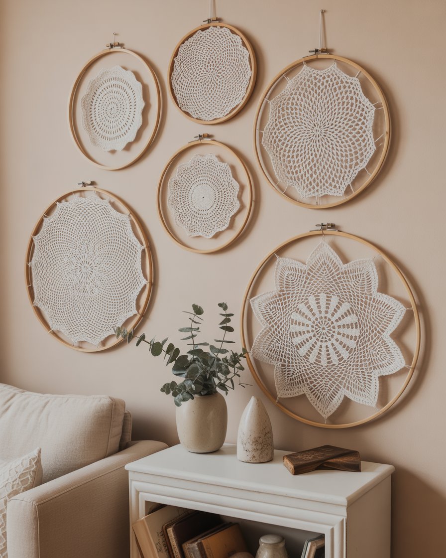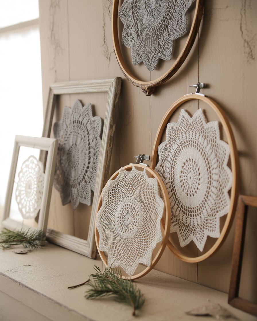 Move crochet beyond blankets — turn intricate crochet pieces into wall art for a vintage winter look. Hanging neutral doilies in layered frames or embroidery hoops gives your bedroom, hallway, or classroom a soft, textural update. It’s a simple diy project that embodies primitive charm while staying aesthetic and unexpected. This works especially well after Christmas to keep walls visually warm.