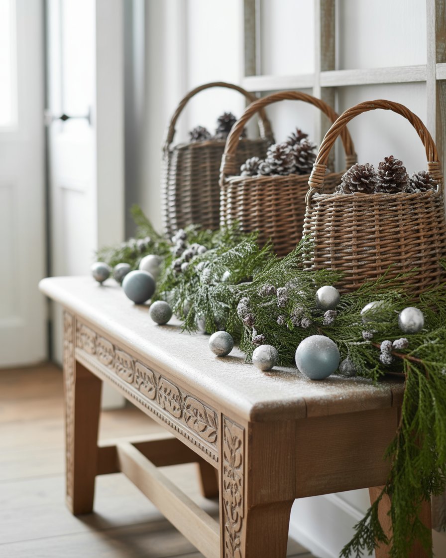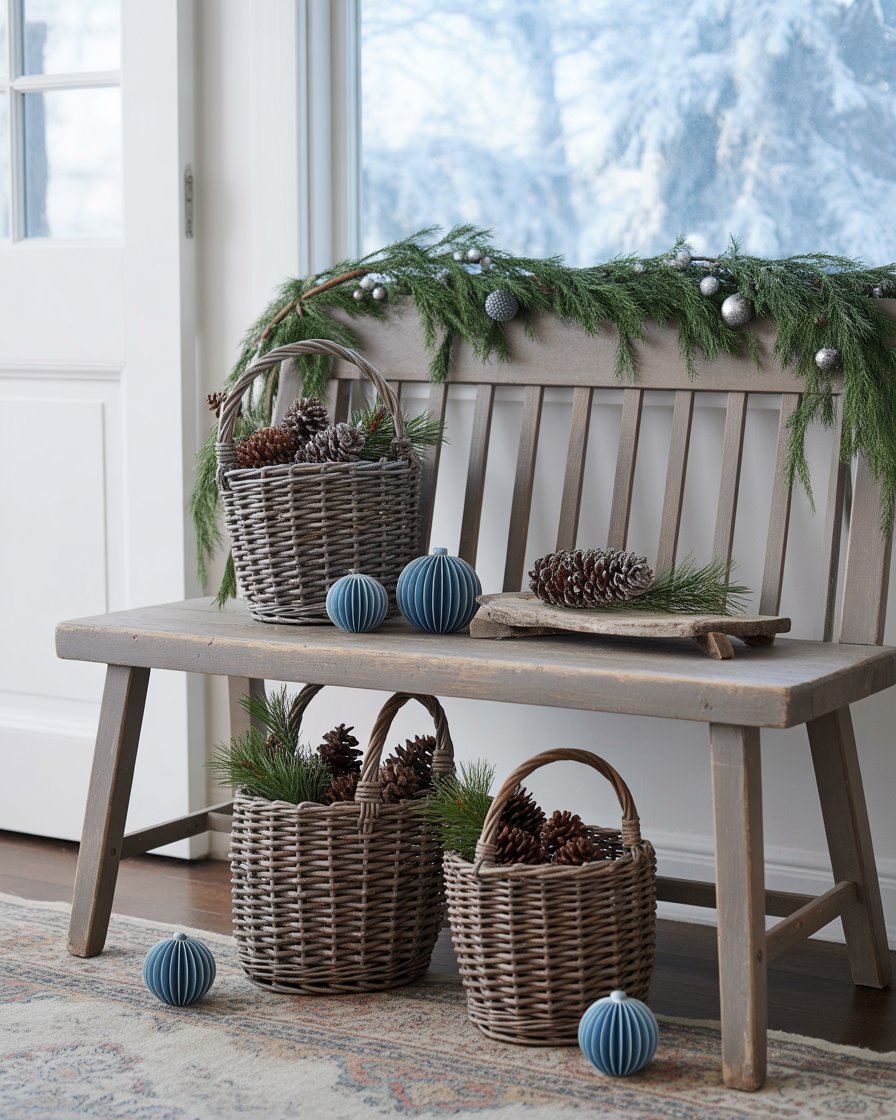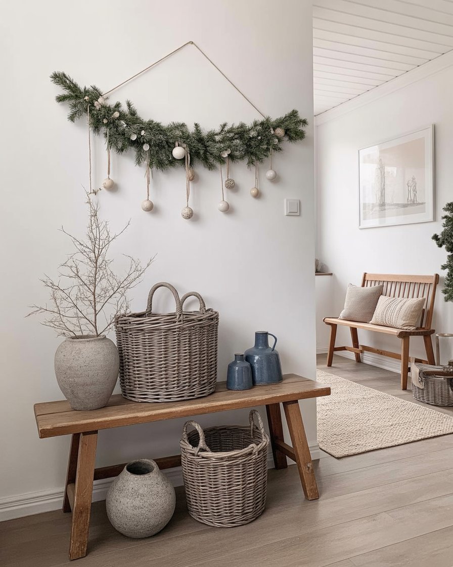 Rustic wood benches meet Scandinavian simplicity to keep entryways practical and pretty. Wicker baskets and wool throws with natural garlands and blue ceramic accents make their winter statement, while the ideas for the home approach feels cozy and put together post-Christmas, even more so when accompanied by a statement mirror or pendant light above the bench.