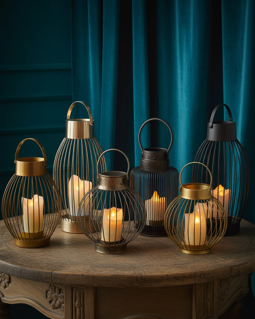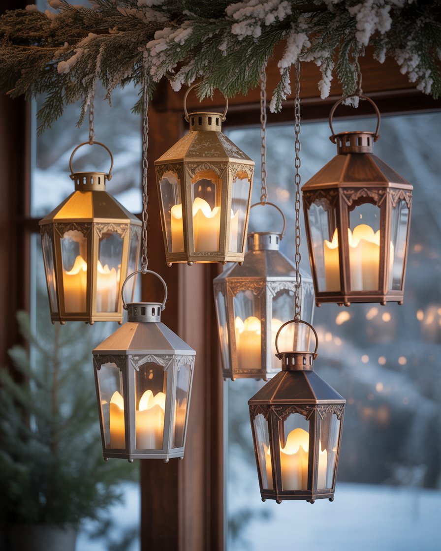 Hanging lantern clusters are a simple yet striking winter decorations idea for living rooms, hallways, or wedding venues. Mixing different lantern shapes and metallic finishes (gold, silver, rustic iron) at varying heights creates an enchanting atmosphere after Christmas. Add LED candles inside for soft, flickering light that feels cozy and elegant without leaning on overt holiday decor.