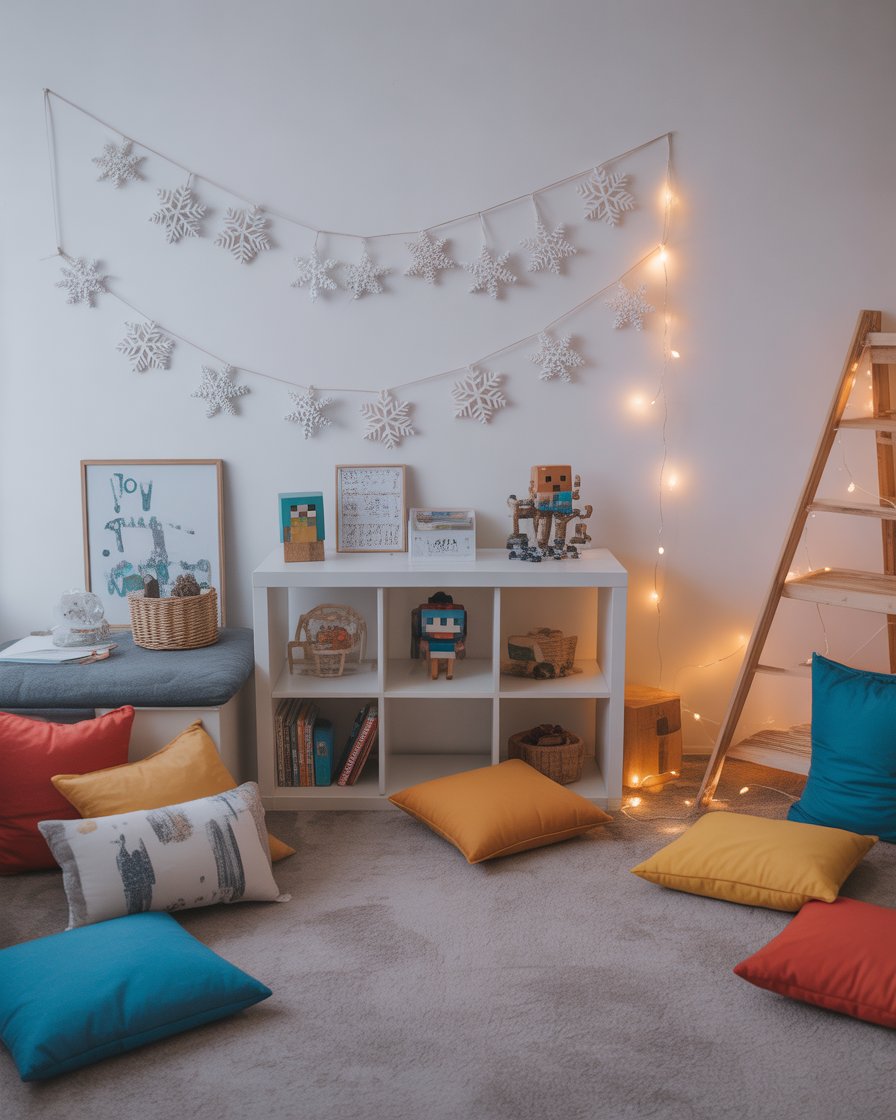 Winter classroom decor doesn’t have to be dull. Set up bright reading corners with soft rugs, string lights, and Minecraft-themed or Scandinavian elements to keep students engaged. Use colorful cushions and diy snowflake garlands to make the space feel cheerful that’s not Christmas. It’s one of the most effective ideas to create inviting learning spaces during colder months.