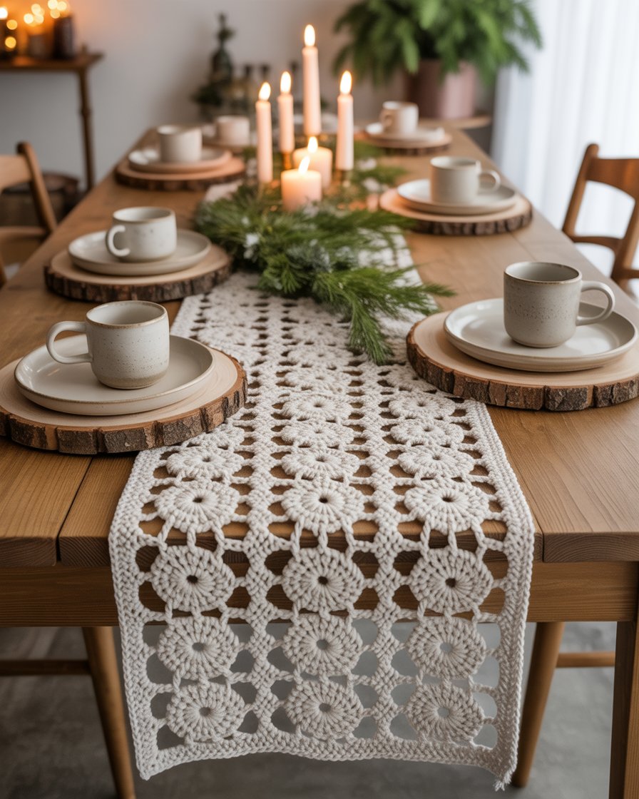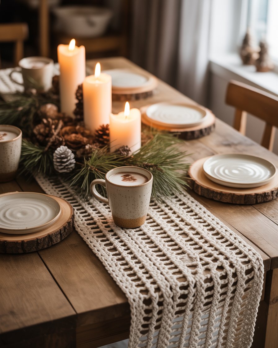 For dinner parties, crochet table runners combined with primitive wooden chargers and ceramic mugs create a charming aesthetic. This mix of handmade and natural elements works wonderfully after Christmas for gatherings that celebrate the season without being overly festive. Adding greenery and candles keeps the table feeling cozy and grounded — ideal for rustic winter entertaining.