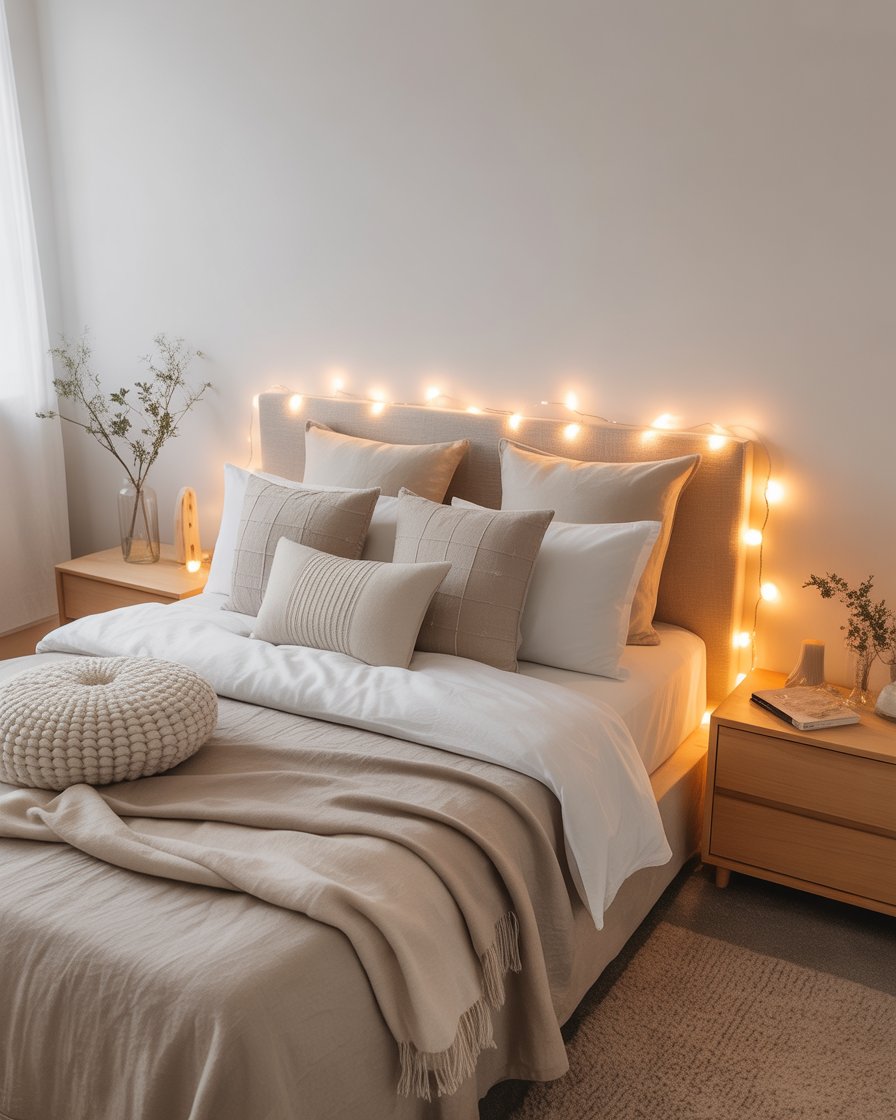 Lastly, the bedroom can shine with a neutral, Scandinavian winter glow. Layer linen sheets with thick wool blankets, hang fairy lights along the headboard, and place natural wood nightstands for a calming, cozy look. This is one of those ideas for the home that feels both simple and luxurious. It’s perfect for winding down on long, dark winter nights.