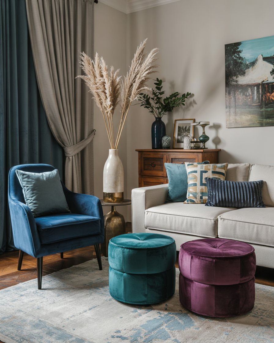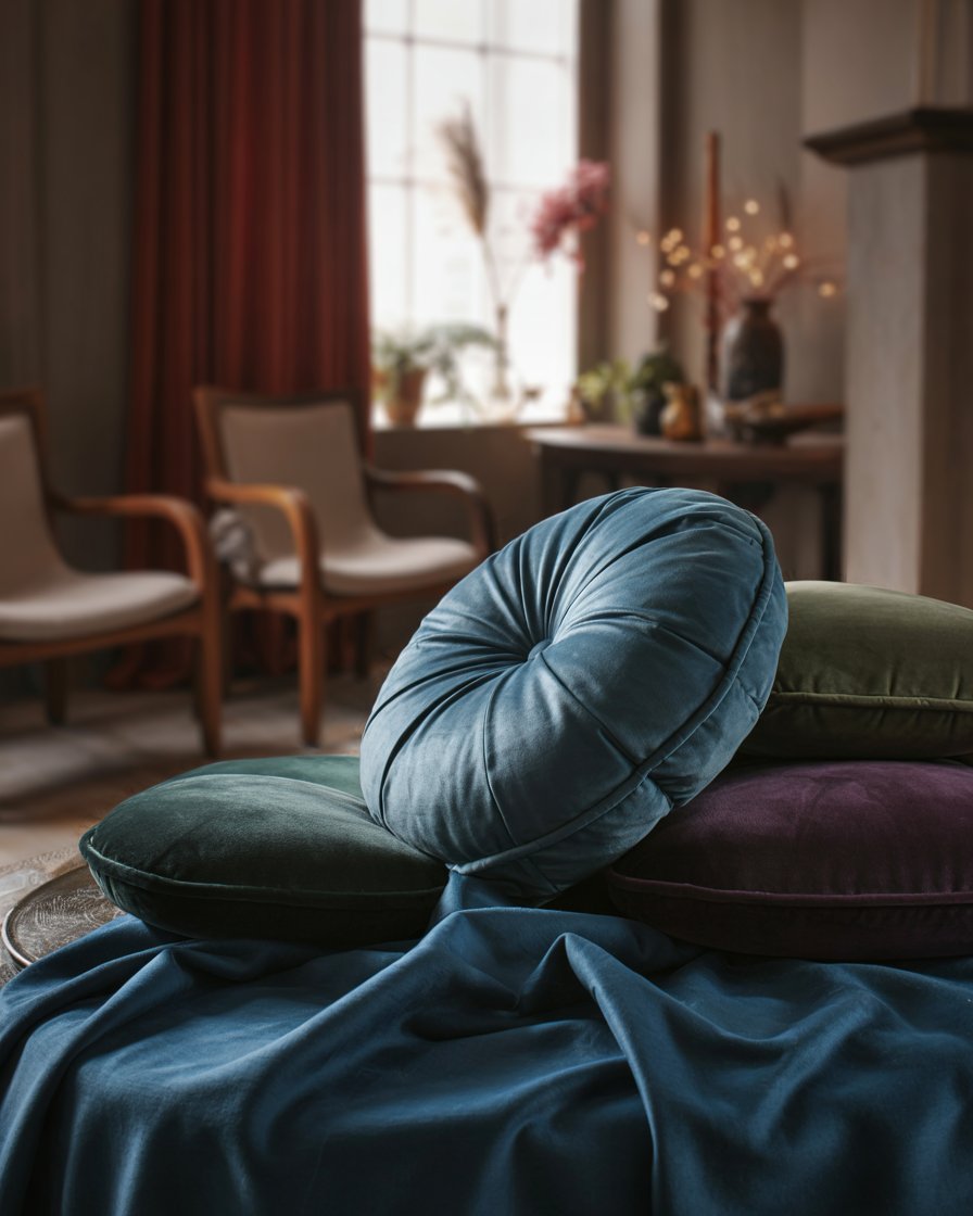 Rich blue, emerald, and plum velvet cushions or curtains instantly elevate winter decorations, creating a warm, luxe atmosphere that works after Christmas. This aesthetic pairs beautifully with neutral walls and rustic wood furniture, adding a dramatic splash of color. Jewel tones feel especially inviting during cold months, and they transition seamlessly into winter wedding or indoor event styling for a cozy yet bold effect.