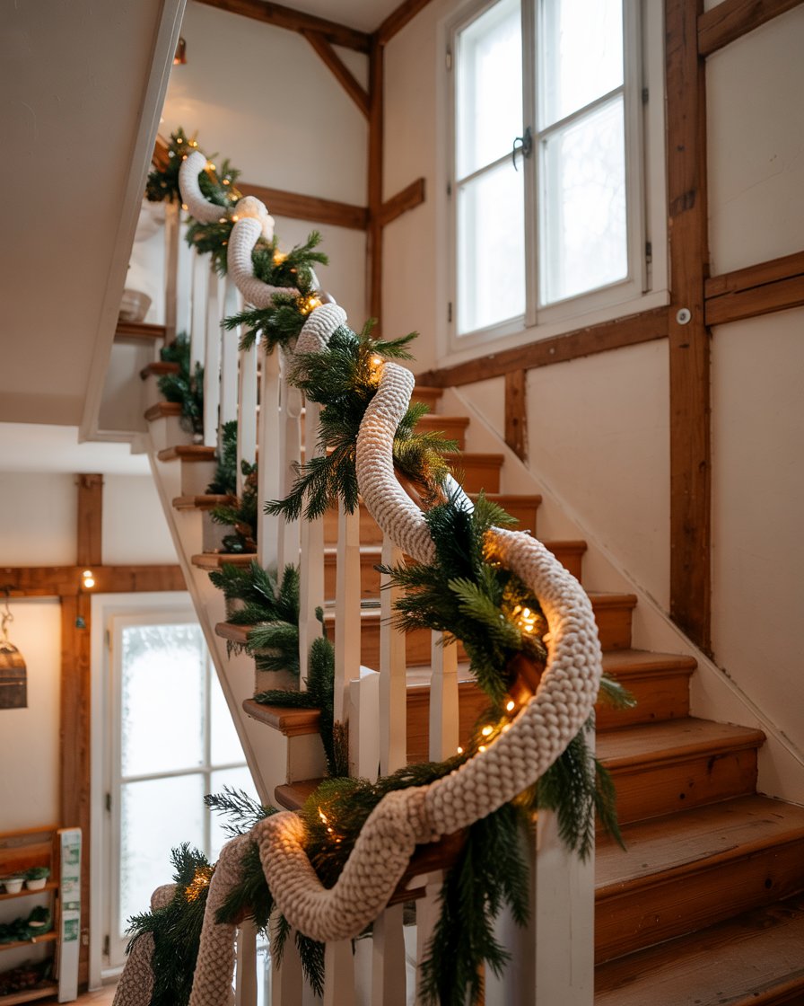 Decorating stair railings with crochet garlands and natural greenery brings a handcrafted charm to ideas for the home cozy. Instead of traditional tinsel, soft yarn garlands drape gently along the banister, paired with pine sprigs and fairy lights. This diy approach works beautifully after Christmas, giving staircases a primitive and rustic look that feels bright and personal without holiday overload.