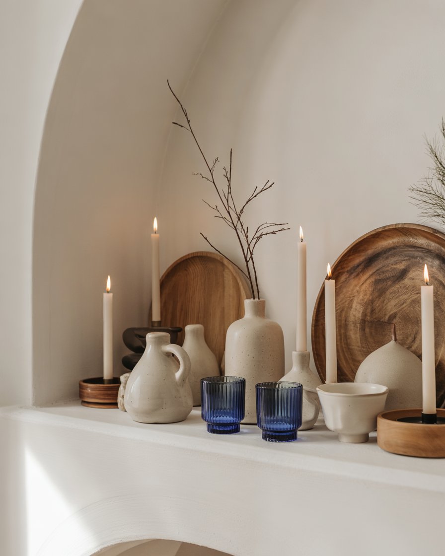 Post-Christmas mantles present a fantastic clean slate after the tree comes down. Swap out heavy holiday stockings for simple, neutral shapes like blue ceramics, taper candles, and pinecones for an elevated ideas for the home look. The interplay between the tones of blue and cream works to bring a touch of composure for the rustic accents to keep it grounded. It’s a minimalist approach that stands for winter itself rather than one holiday.