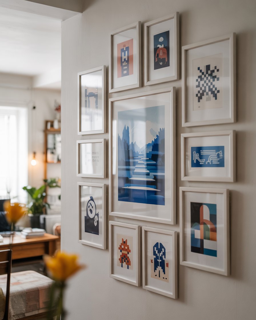 Gallery walls aren’t just for summer. Mixing winter decorations like blue-toned landscape prints, Minecraft-inspired pixel snowflakes, and aesthetic line drawings creates a playful, modern vibe. Use neutral frames for balance and include diy elements for a personal touch. This look is bright, youthful, and perfect for classroom, hallway, or family living spaces during the winter season.