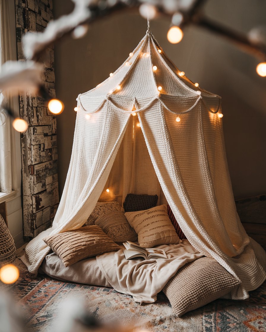 For bedroom corners or children’s play areas, crochet canopy tents create magical winter decorations that feel both primitive and fairytale-like. Add string lights inside, layer soft rugs and pillows, and finish with natural textures for a cozy reading retreat. This idea works beautifully after Christmas, especially in nurseries, kids’ spaces, or boho-inspired homes.