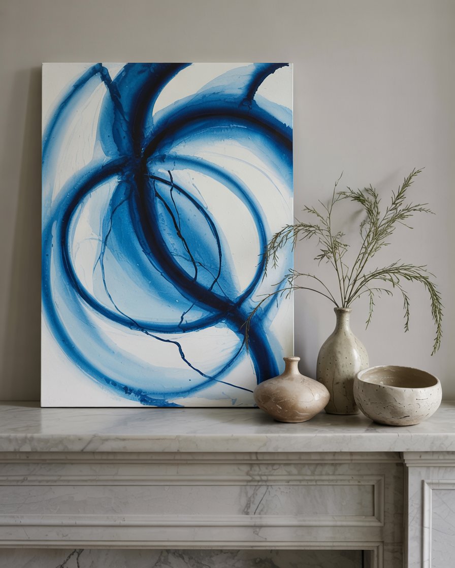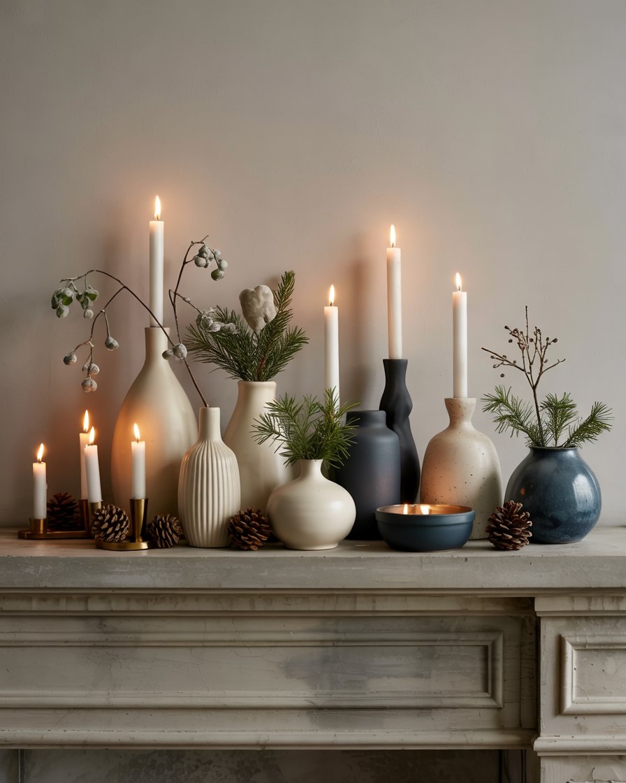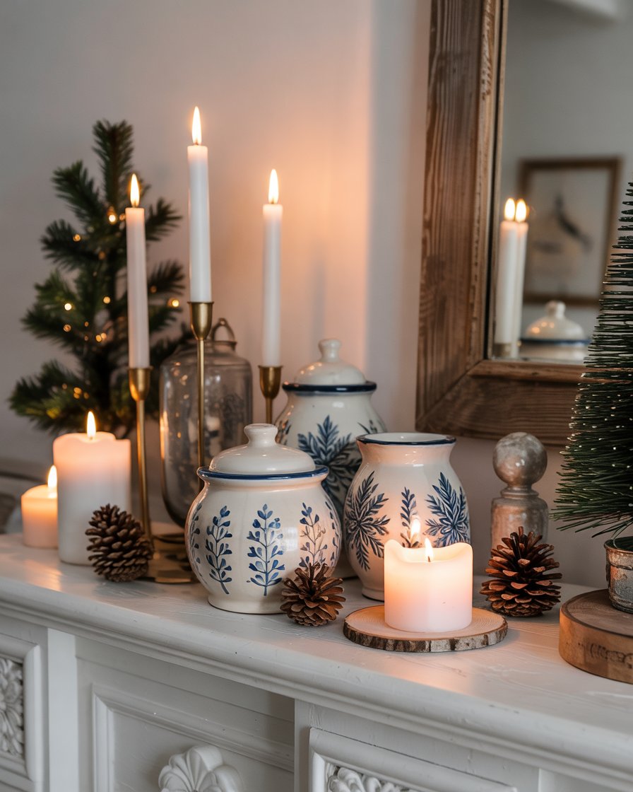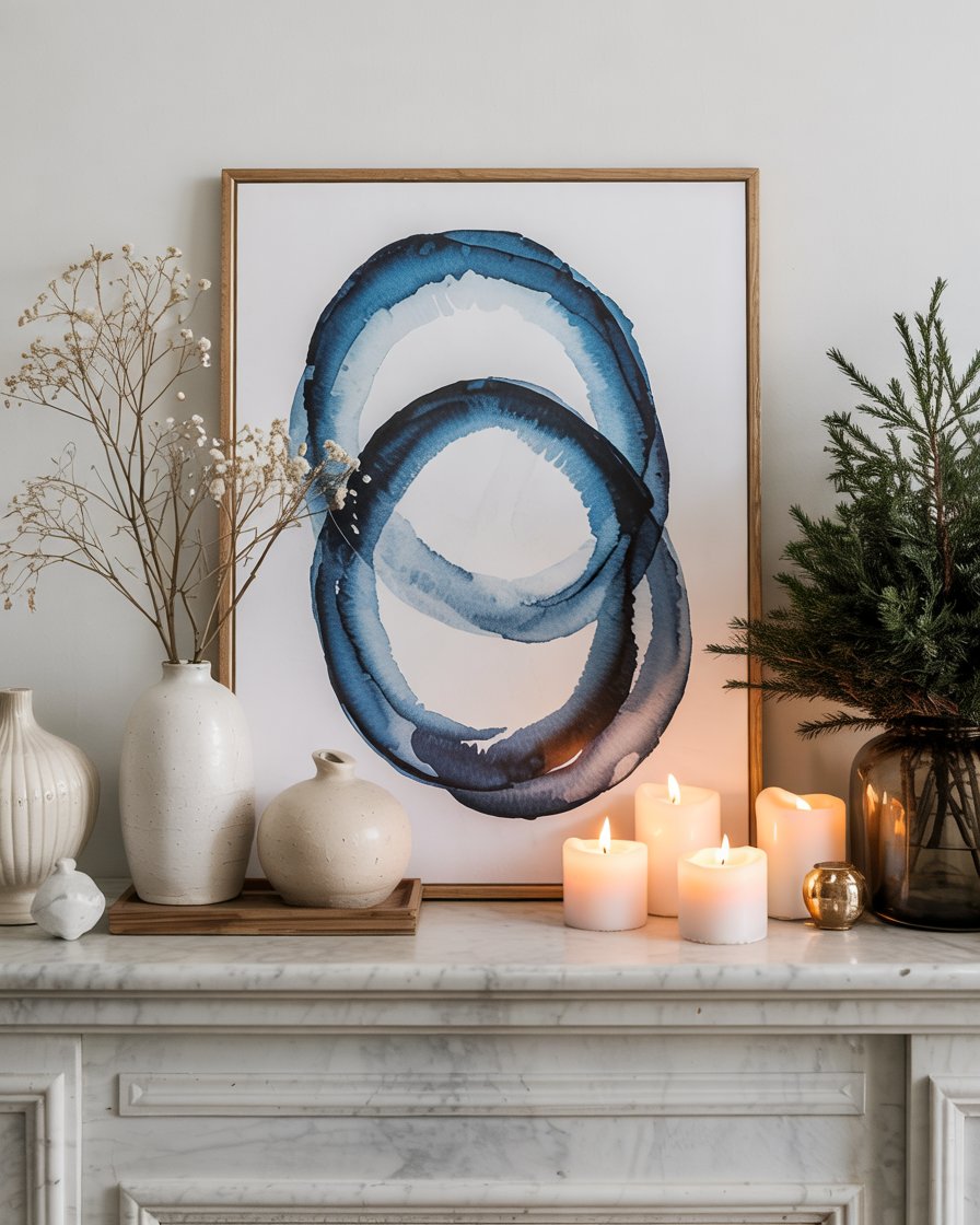 This year, after Christmas mantles are being transformed with blue abstract art, neutral pottery, and layered candle arrangements. Instead of heavy greenery, a single bold canvas paired with sculptural vases keeps the look fresh and modern. It’s one of the most elegant ideas for the home that balances aesthetic sophistication with cozy winter warmth.