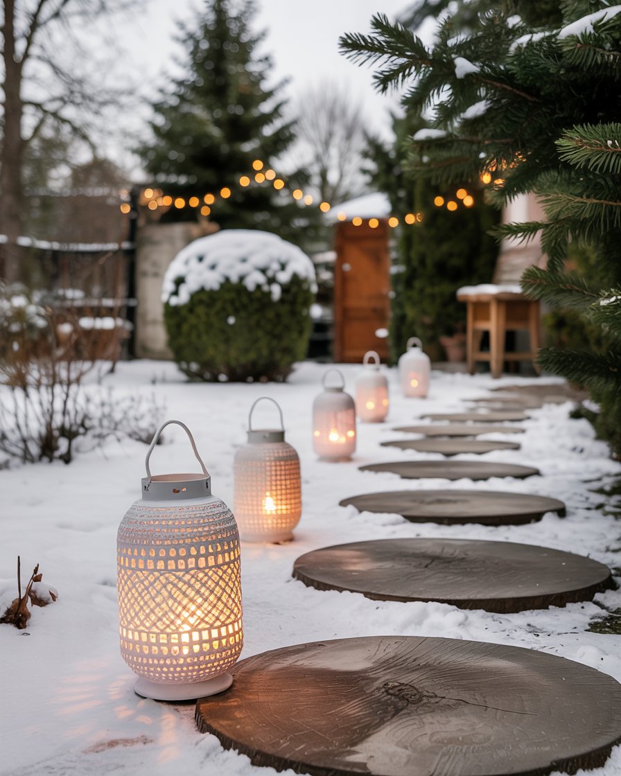 Illuminate garden paths with crochet-covered lanterns for a unique outdoor winter touch. Handmade crochet sleeves slipped over glass jars create intricate shadows when lit, blending rustic, primitive, and diy charm. This idea is ideal after Christmas, when twinkling lights and natural beauty can transform simple pathways into enchanting winter scenes.