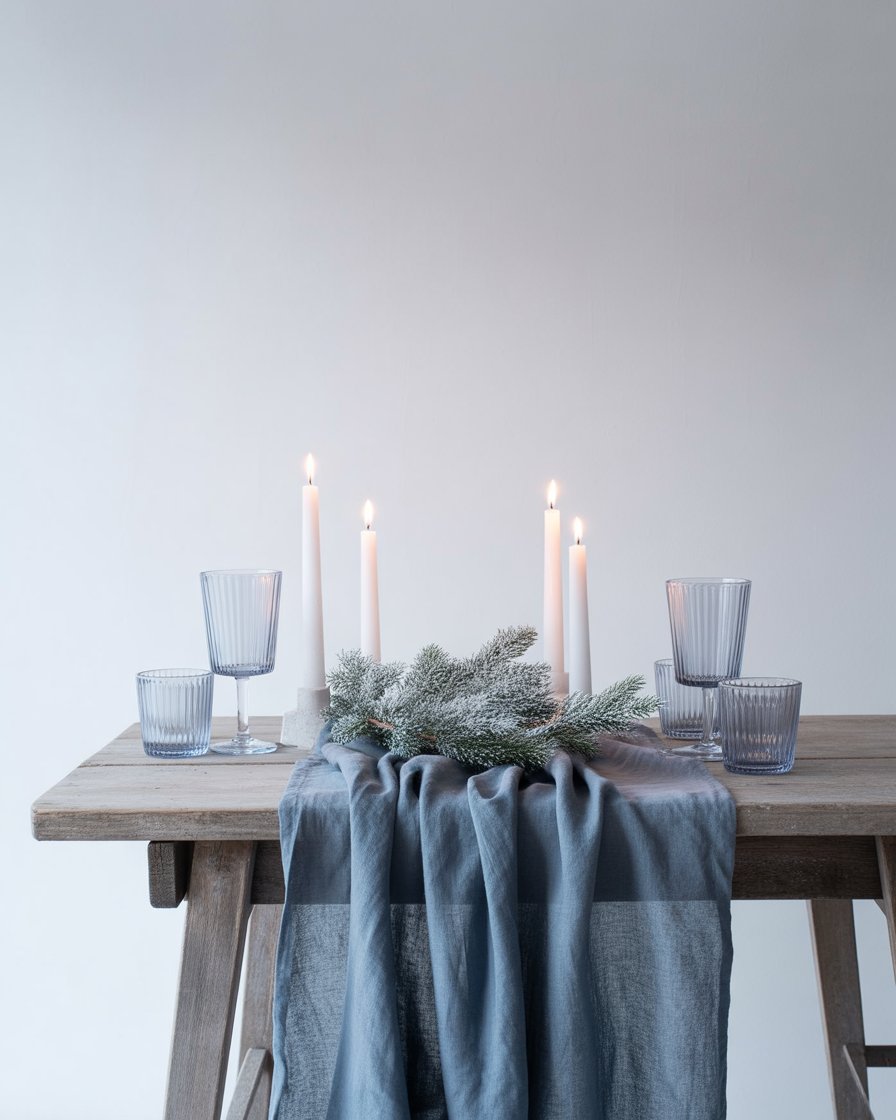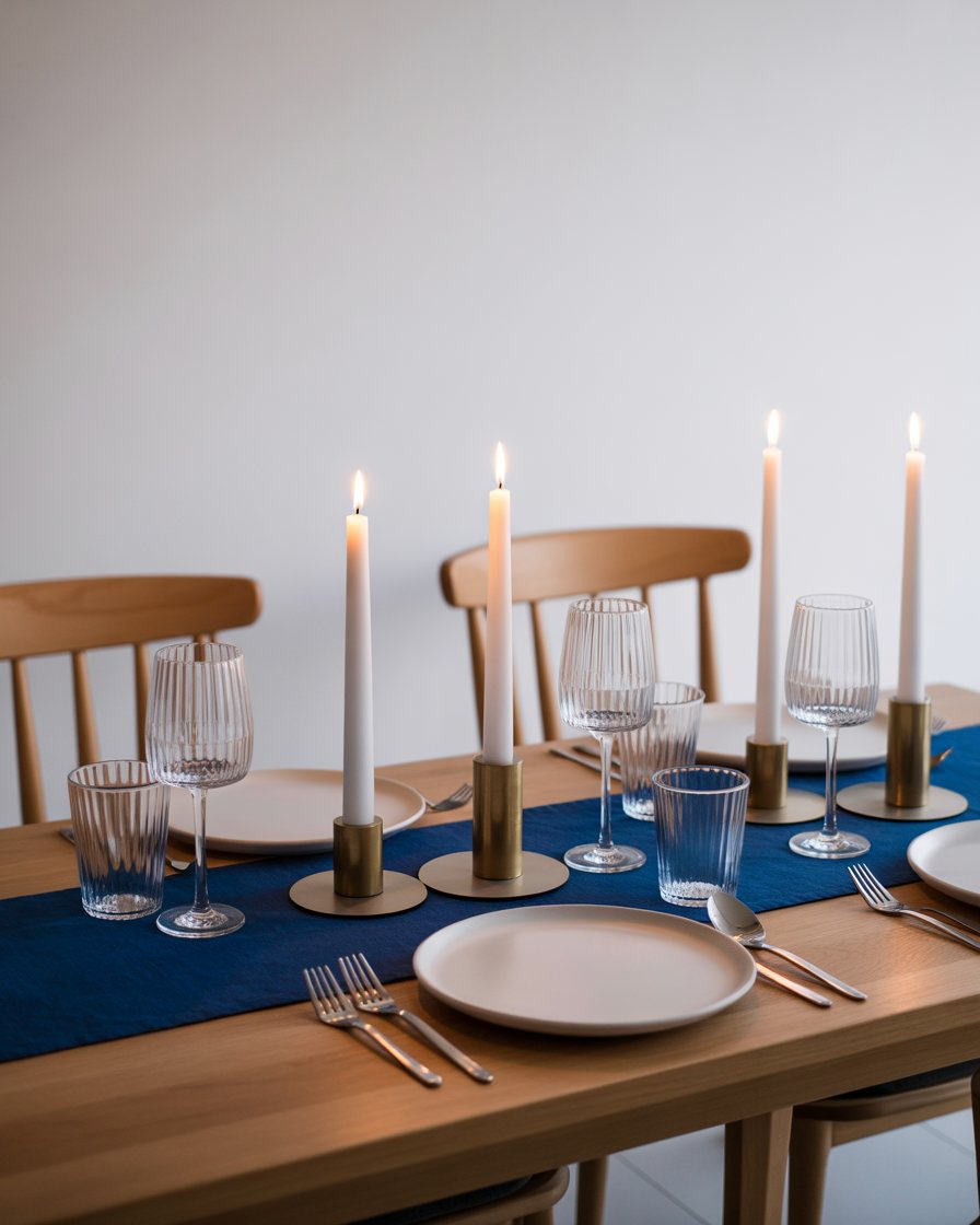 Blue dining accents intersection of Scandinavian styling with modern elegance. Crisp white walls, wooden tables, and minimalist dishware create a clean base with deep blue runners, candles, and glassware that maintain the classy winter feel. Ideal for wedding receptions, ideas for the home, or dinner parties that go on after the holidays. It is simple, elegant, and easy to update.
