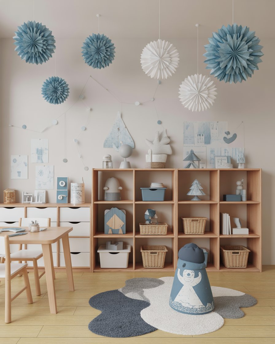 For teachers or parents, Scandinavian-inspired classroom corners offer simple, clean ideas to create calm, focused spaces during the winter months. Wooden shelves, blue and white accents, and cozy rugs bring a sense of Hygge to classroom environments without overloading on holiday themes. Add a few diy crafts like paper snowflakes to keep it budget-friendly and engaging for kids.